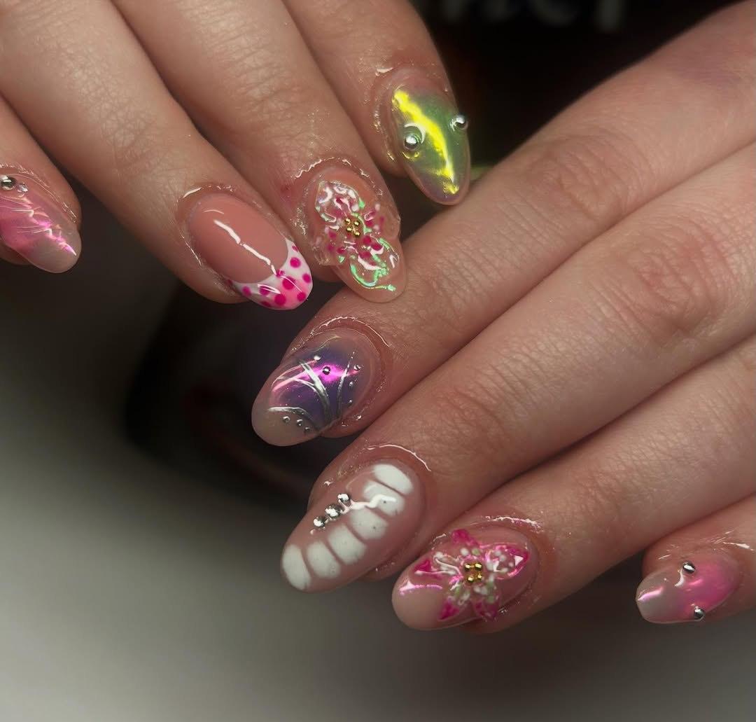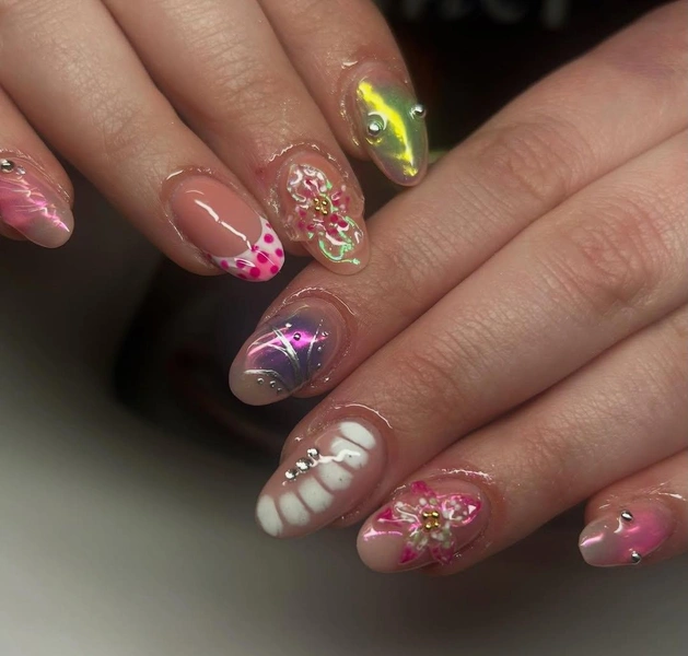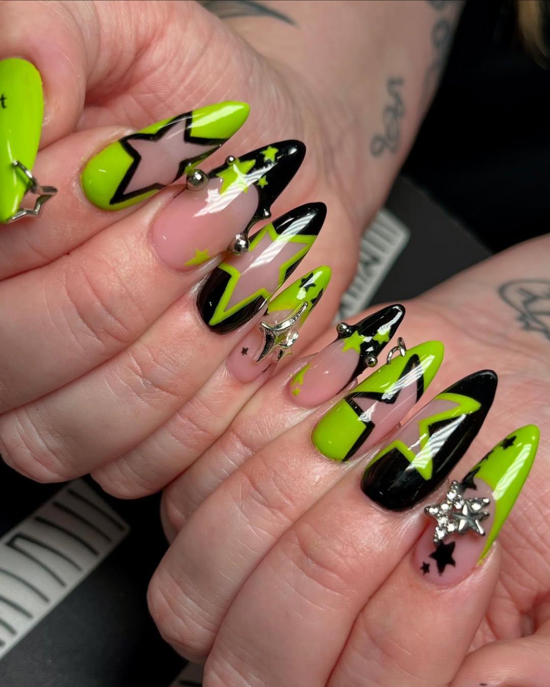 Разноцветные и сочные ногти всегда круто смотрятся с разными объемными украшениями. Это может быть как имитация пирсинга, так и сережки-колечки, элементы со стразами, 3D-звезды. Такой дизайн только выигрывает от разнообразия деталей.