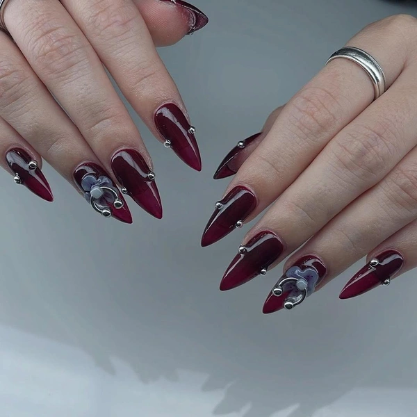 Темные ноготочки тоже круто смотрятся с пирсингом. Можешь выбрать любой лак: изумрудный, сапфировый или даже просто черный. Но я советую обратить внимание на классический винный, бордовый, темный вишневый. А если захочешь разнообразить дизайн, размести на ногтях разные виды сережек. И, конечно, не забудь увлажнить руки после маникюра!