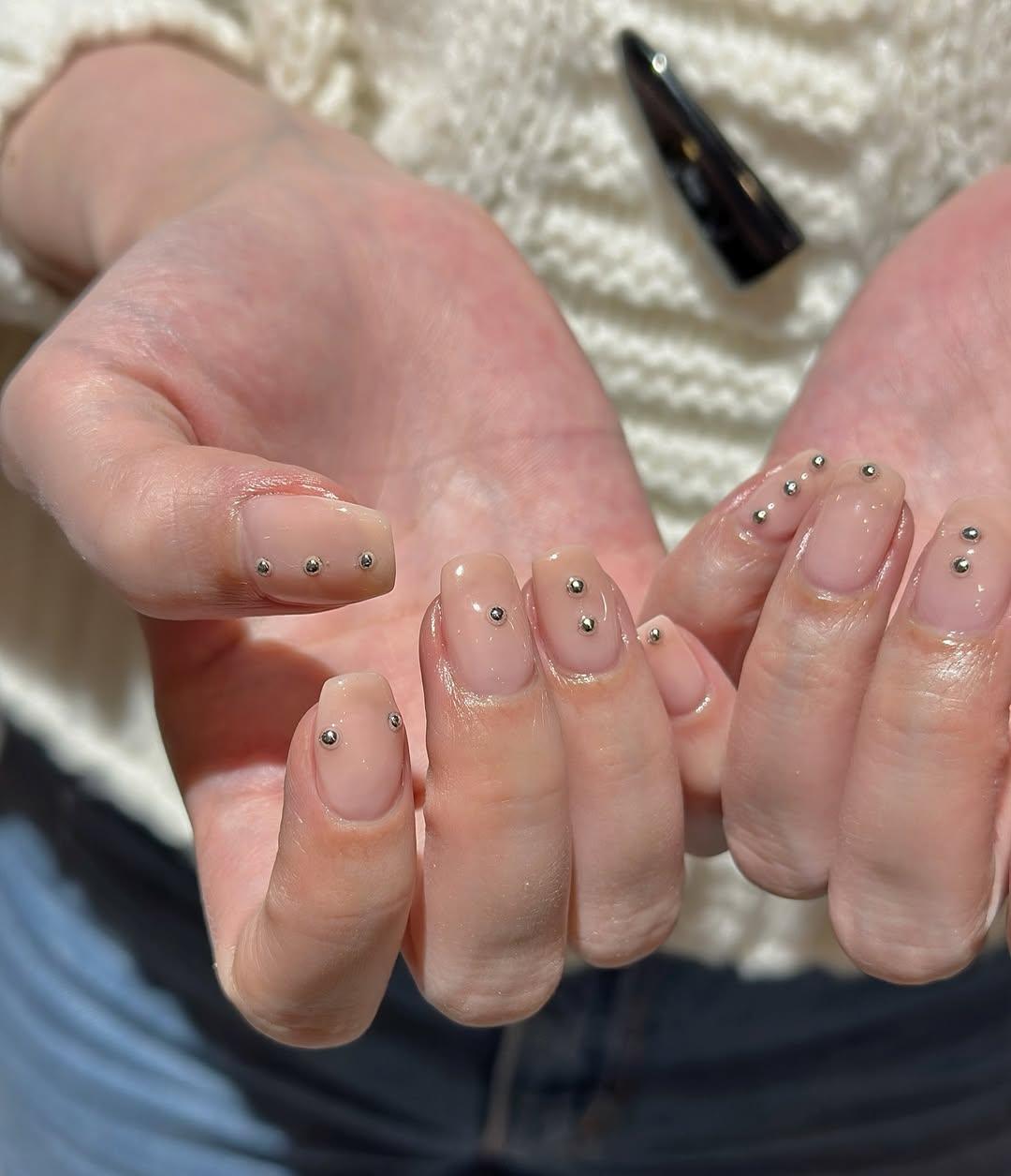 Если тебе нравится нюд или просто минимализм, то ты смело можешь украсить нейтральный лак сияющими шариками, имитирующими серьги. Располагай из так, как нравится: три «сережки» в центре ногтя, две по бокам, одна на свободном крае или у кутикулы.