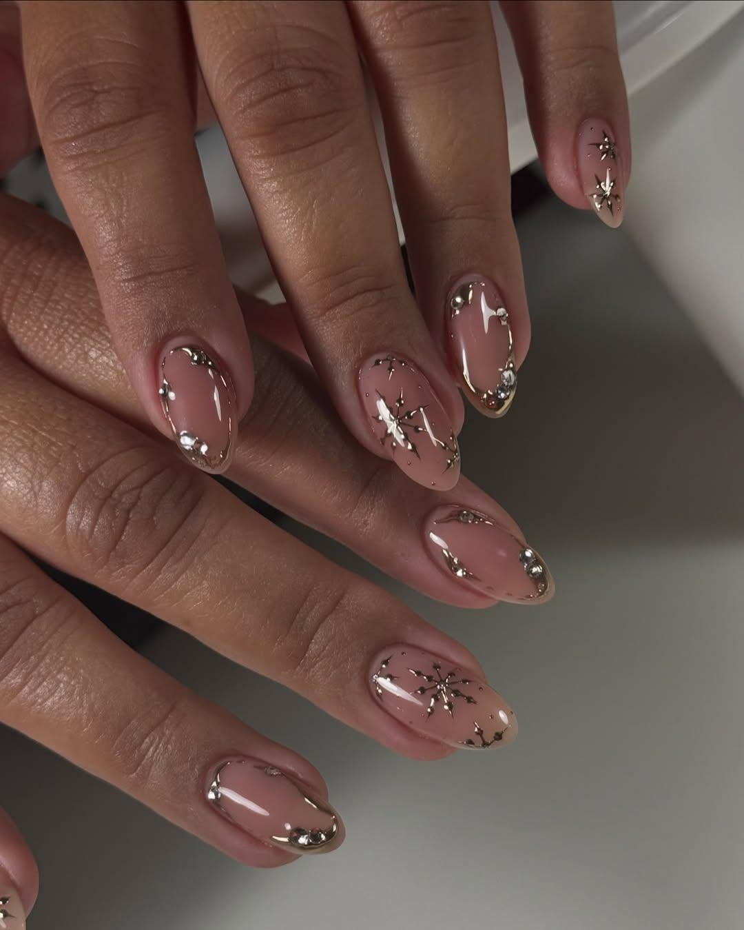 Лови элегантный нюдовый или молочный маникюр, где основной акцент сделан на объеме и блеске. В нем свободный край ногтей обрамлен тонкой золотой линией, а в центре нескольких расположены объемные золотые снежинки, инкрустированные мелкими стразами.