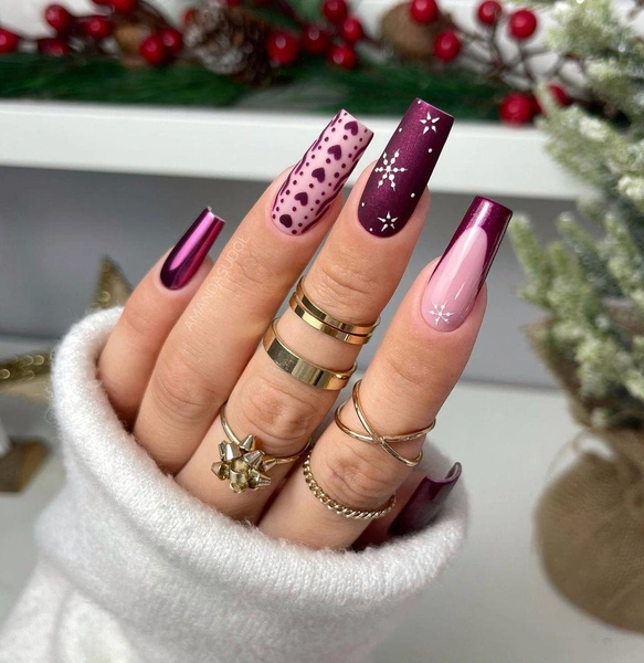 Длинные ногти квадратной формы с насыщенными цветами смотрятся очень стильно. Один ноготь полностью покрыт темно-фиолетовым лаком с узором в виде сердечек, другой украшен градиентом от фуксии к сиреневому. На безымянном пальце красуется нежная белая снежинка на фоне светлого фона, дополненная ярким металлическим френчем на соседнем ногте.