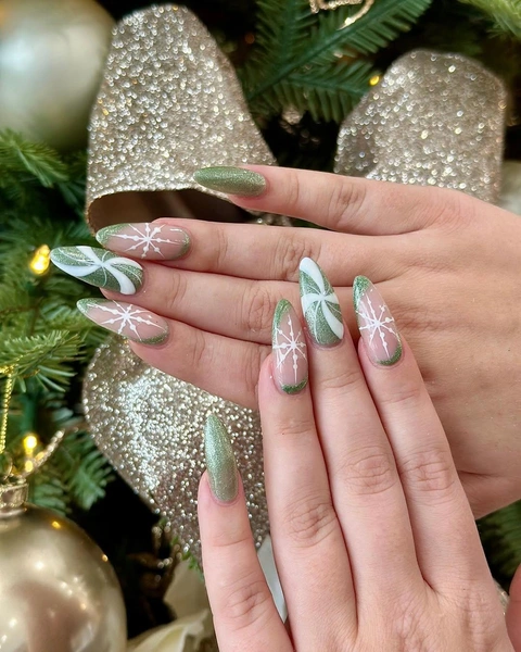 Свежий и прохладный дизайн с использованием мятно-зеленых оттенков понравится тем, кто не хочет делать яркий маникюр. Лови идею: на некоторых ногтях однотонный лак или мятно-белые завихрения, а на прозрачной базе аккуратно нанесены мерцающие серебристые снежинки.