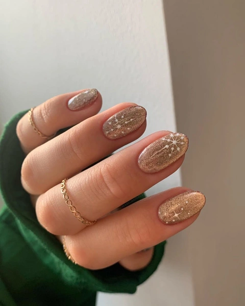 Теплый и уютный маникюр в оттенках шампанского и золота, выполненный с использованием бархатистой или велюровой текстуры глиттера, станет лучшим вариантом для минималисток. В этом дизайне на одном или двух ногтях поверх мерцающего покрытия расцветает четкая, стилизованная снежинка, выполненная белым или серебряным лаком. А ты можешь поэкспериментировать и выбрать россыпь маленьких снежинок.