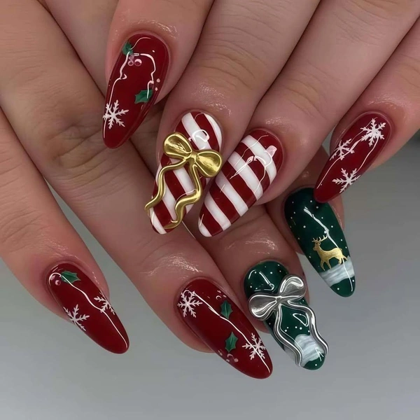В новогодней палитре этого сезона преобладают глубокий бордовый и изумрудный оттенки. Так что твой маникюр может включать в себя элементы в виде белых снежинок, глянцевых золотых бантиков, контрастных красно-белых полосок, напоминающих леденцы, и даже милый рисунок оленя.