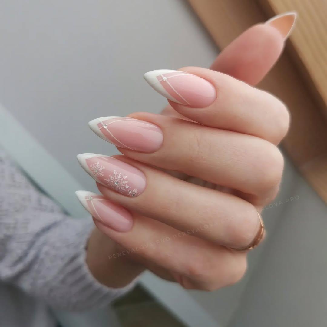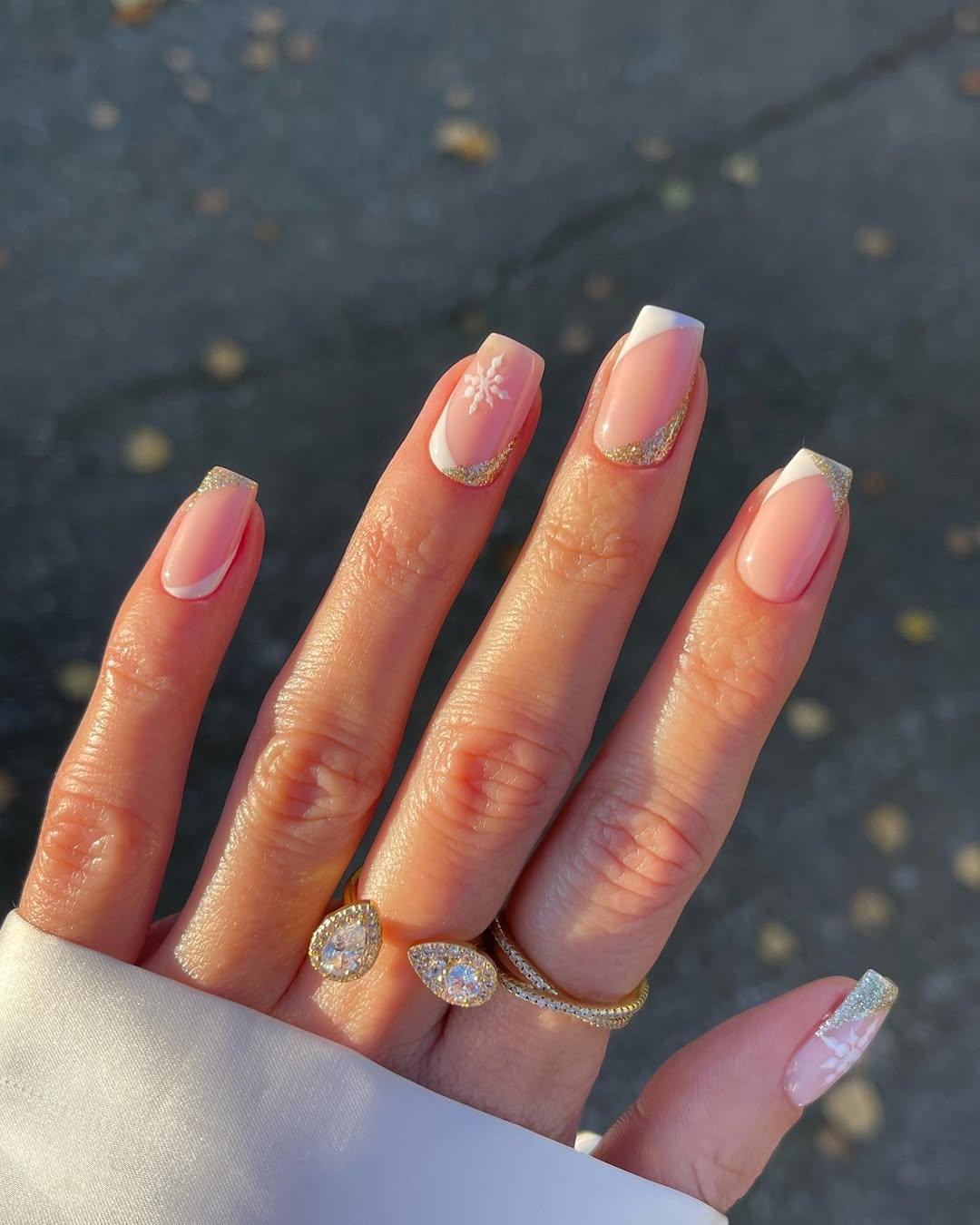 Идеальный вариант для любительниц минимализма — это ногти формы мягкий овал с классической розовой базой. Тонкая, но заметная линия улыбки френча выполнена деликатным золотистым глиттером, а на одном из ногтей красуется крошечная белая снежинка, подчеркнутая тонкой золотой линией.