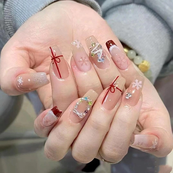 Дизайн, сочетающий прозрачную базу с нежным градиентом, где на каждом ногте присутствует элемент декора впишется в любой образ. Наноси на пальчики тонкие красные бантики, белый френч с золотой втиркой, полупрозрачные снежинки и объемные элементы, создающие многомерный праздничный эффект.