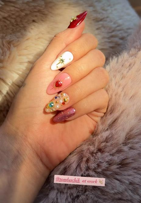 Но если Селена чаще всего выбирает классику, это не значит, что она полностью отказалась от экспериментов. Хоть и редко, но в ее луках порой можно заметить что-то ну очень смелое. В этот раз она удивляет маникюром — красно-розовым дизайном ногтей с миллионом страз разных форм и размеров.