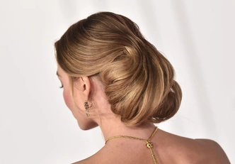 Кончики волос заткнуты внутрь прически — ни одна прядь не выбивается, все идеально гладко. Это создает эффект законченности и элегантности. Прическа выглядит сложной, что полностью соответствует духу фильма и наряда Марго. Такой пучок требует профессионального исполнения: волосы должны быть идеально гладкими, а фиксация — надежной. Это не та прическа, которую можно сделать за пять минут дома, но результат стоит усилий.