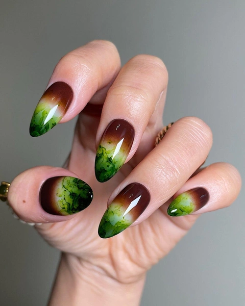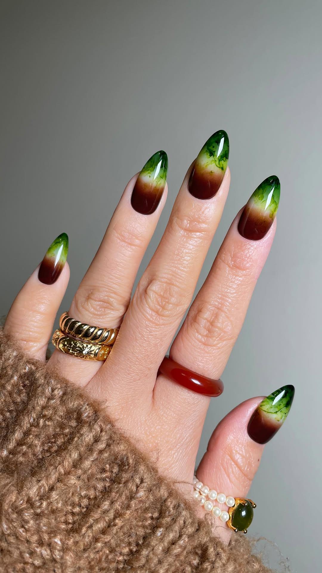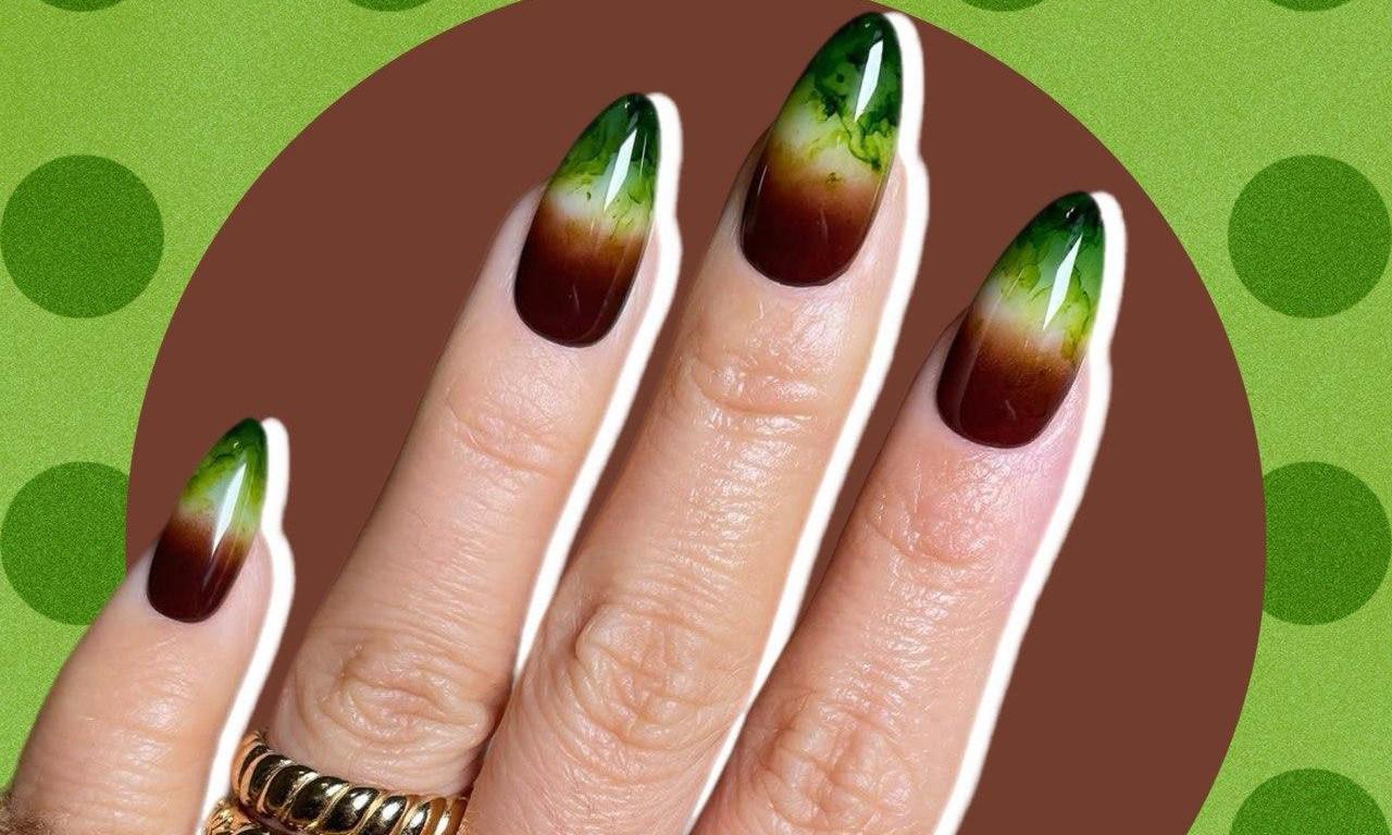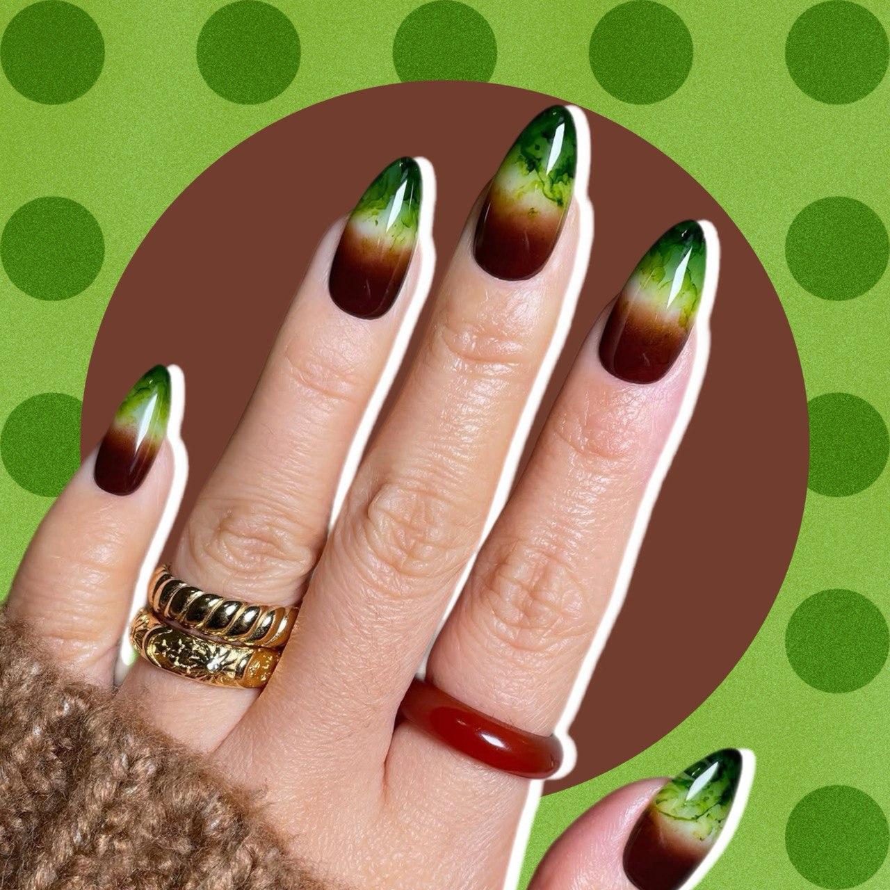 Маникюр цвета матчи, молока и кофе — это очень красивый контраст. Два противоположных цвета — коричневый и зеленый — объединены нейтральным молочным, который смягчает переход. Градиент делает дизайн плавным и очень красивым, а акварельные прожилки добавляют интересную деталь. Этот маникюр подходит для весны и лета, хорошо смотрится на любой длине ногтей и сочетается с любым гардеробом.