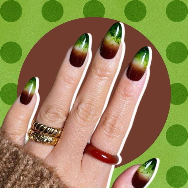 Этот маникюр строится на плавных переходах между тремя цветами, создавая эффект многослойности и глубины. Дизайн начинай с насыщенного кофейного оттенка у основания ногтя. Лучший вариант — глубокий теплый коричневый, который ассоциируется с эспрессо или американо.