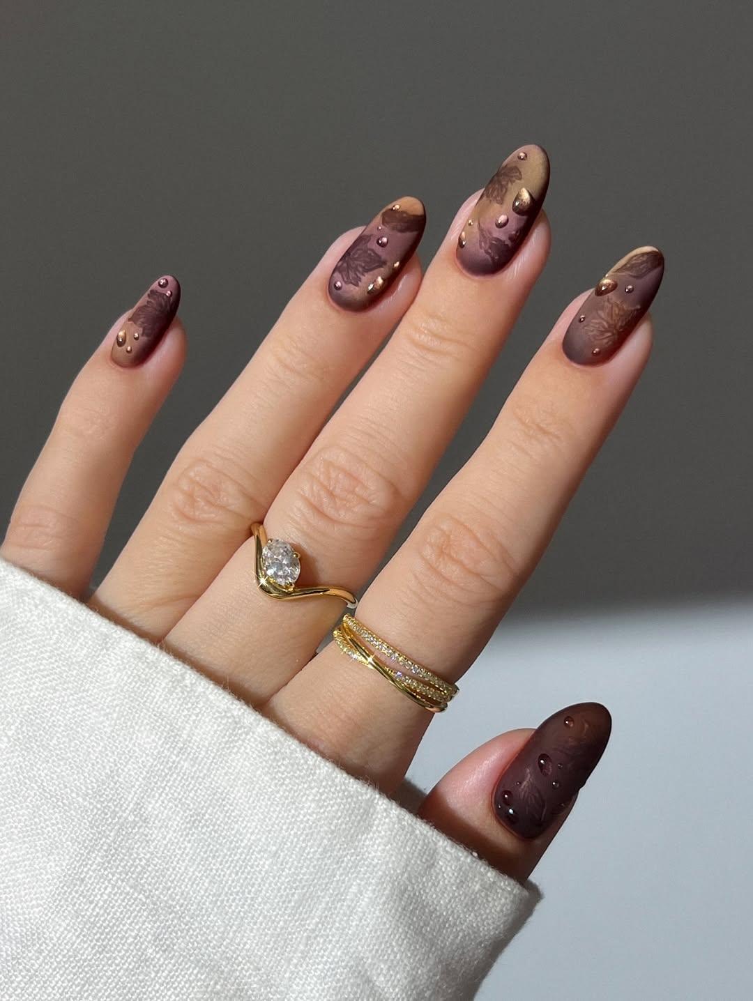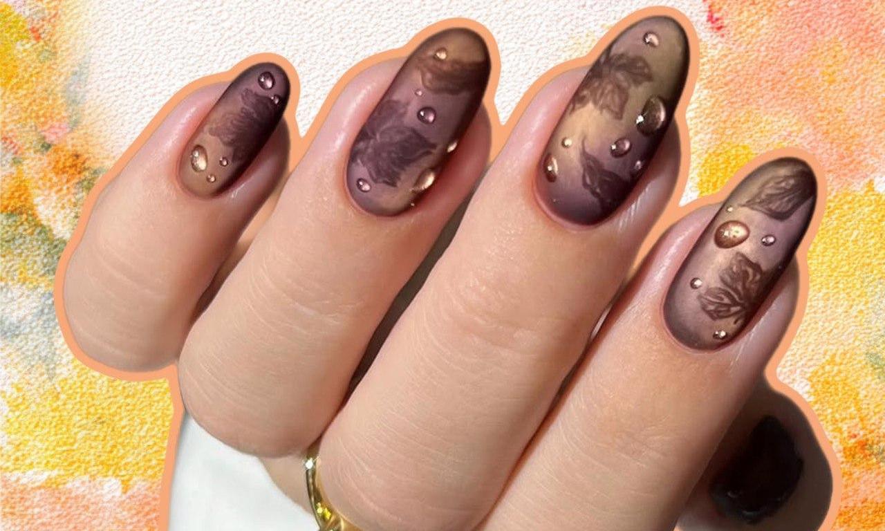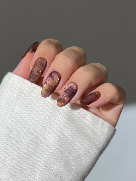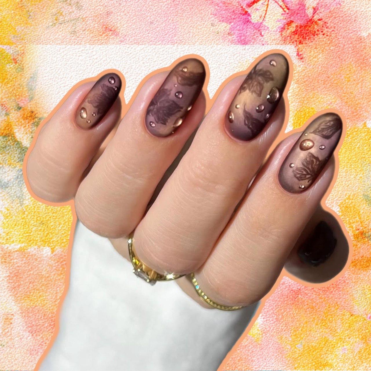 Я нашла вариант маникюра, в котором сочетается все и сразу. Основной фон — эффектный микс из бордовых, кофейных и бронзовых цветов. Он напоминает какой-то роскошный камень или даже шелковую ткань. Матовый топ приглушает блеск, придавая красивую бархатистость. А глянцевые капли выглядят как следы росы или дождя.