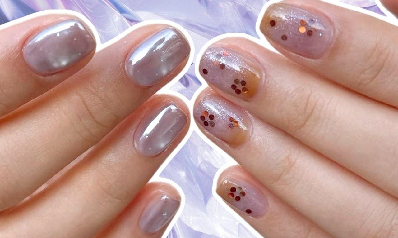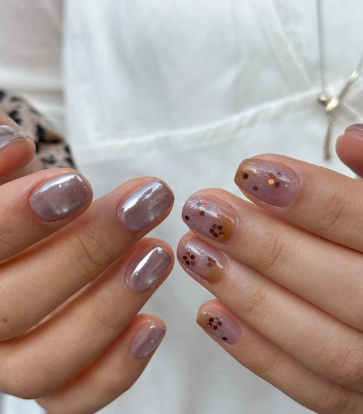 Лавандовый оттенок — один из ключевых цветов корейской зимы 2026. Он нежный и даже немного мечтательный, поэтому прекрасно вписывается в эстетику минимализма. На одной руке сделай очень простой дизайн — покрой ногти лаком, а потом светлой жемчужной втиркой. А на другой укрась ногти серебристым шиммером и выложи из цветного глиттера цветочки.