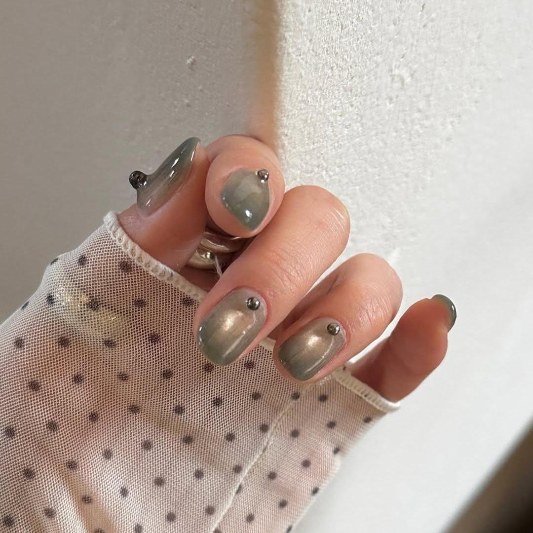 Даже эффект «кошачьего глаза» в корейском маникюре становится минималистичным. Добавление нескольких страз превращает дизайн в акцентный, но все еще очень сдержанный. Главное — выбрать подходящий оттенок базы. Например, коричневый, бежевый, хаки, оливковый, терракотовый.
