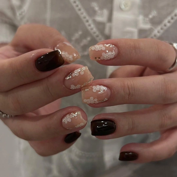 Корейский свадебный маникюр давно вышел за рамки дизайнов только для невест. Зимой 2026 он становится полноценным трендом для всех, кто любит нежную эстетику. На несколько ногтей нанеси бордовый глянцевый лак, а на остальных сделай дизайн. Нюдовая база в сочетании с белыми глиттерными цветочками выглядит очень мило. Носи его, даже если не собираешься замуж.