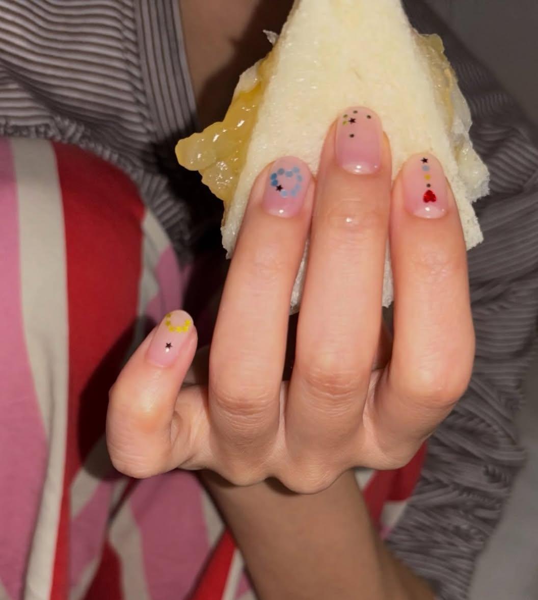 Глиттер в корейском стиле часто смотрится очень изящно и нежно. Наноси его на нюдовую базу — молочную или бежевую. Тонкие линии, точки, мини-узоры вроде сердечек выглядят очень красиво, если создать их из разноцветных звездочек. Для офиса такой маникюр может и не подойти, но смотрится он все равно очень круто!