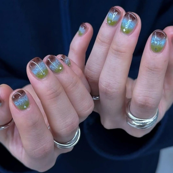 Полоски — еще один любимый прием корейских нейл-мастеров. Но здесь они не графично-резкие, а тонкие, иногда даже слегка неровные, словно нарисованные от руки. Чем-то они напоминают рисунок вязаного свитера. Выбирай яркие цвета — голубой и зеленый. А дополняй их более нейтральным коричневым лаком и глиттером в виде звезд.