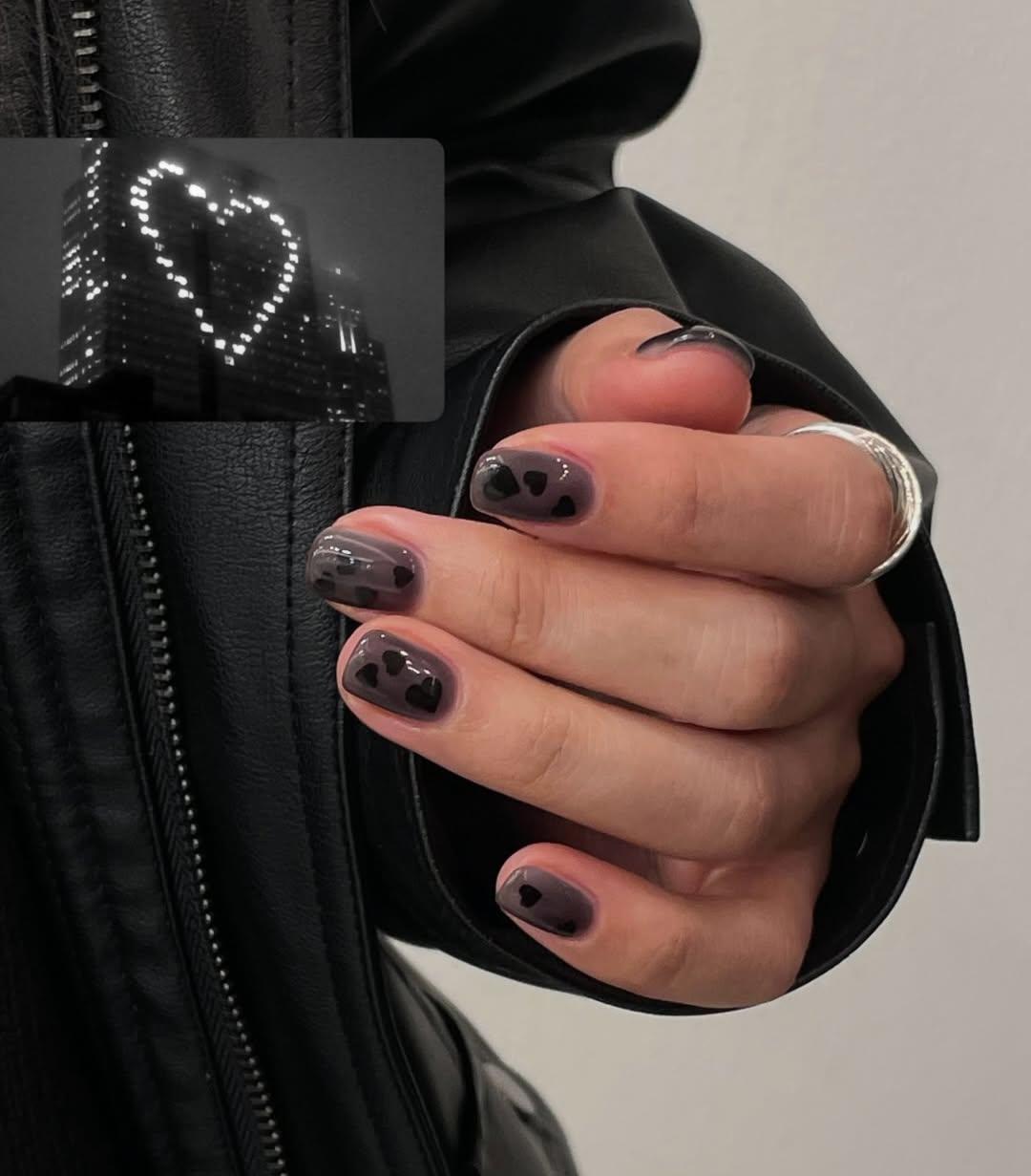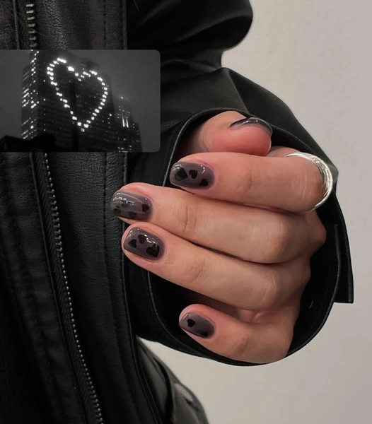 Черный цвет в корейском маникюре выглядит очень сбалансированно. Он не агрессивный, не готичный, не драматичный, как многие западные дизайны. Нанеси на ногти полупрозрачный черный лак, а потом нарисуй плотным цветом сердечки. Маникюр сразу становится мягче и ироничнее! Он подходит и к строгим пальто, и к уютным свитерам, так что смело носи его зимой.