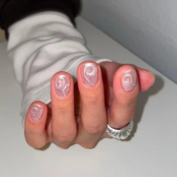 Завитки, тонкие линии и абстрактные элементы — еще один способ добавить интереса минималистичному маникюру. В корейской интерпретации такие завитушки выглядят почти ювелирно. Особенно хочется отметить миниатюрные серебристые точки вокруг завитков на перламутровой базе.