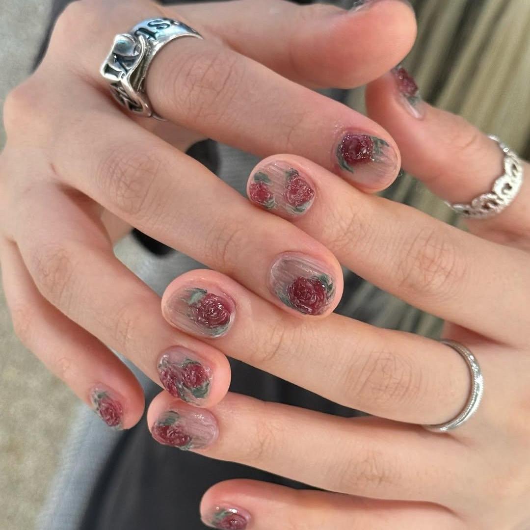 Цветочные мотивы в корейском маникюре яркие и реалистичные. Кажется, будто они нарисованы акварелью. В качестве базы выбирай полупрозрачный черный или серый цвет. Он будет красиво контрастировать с рисунками роз.