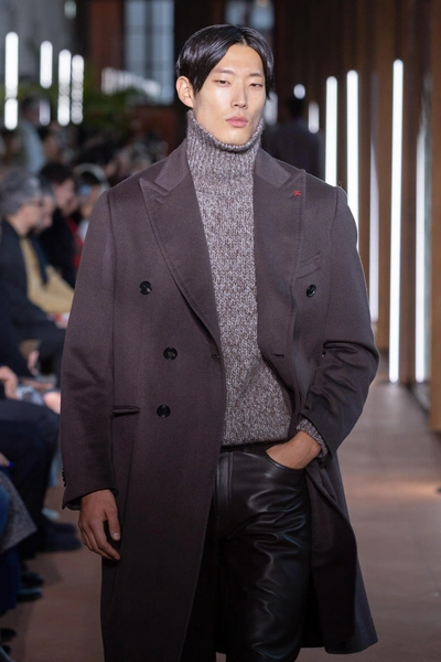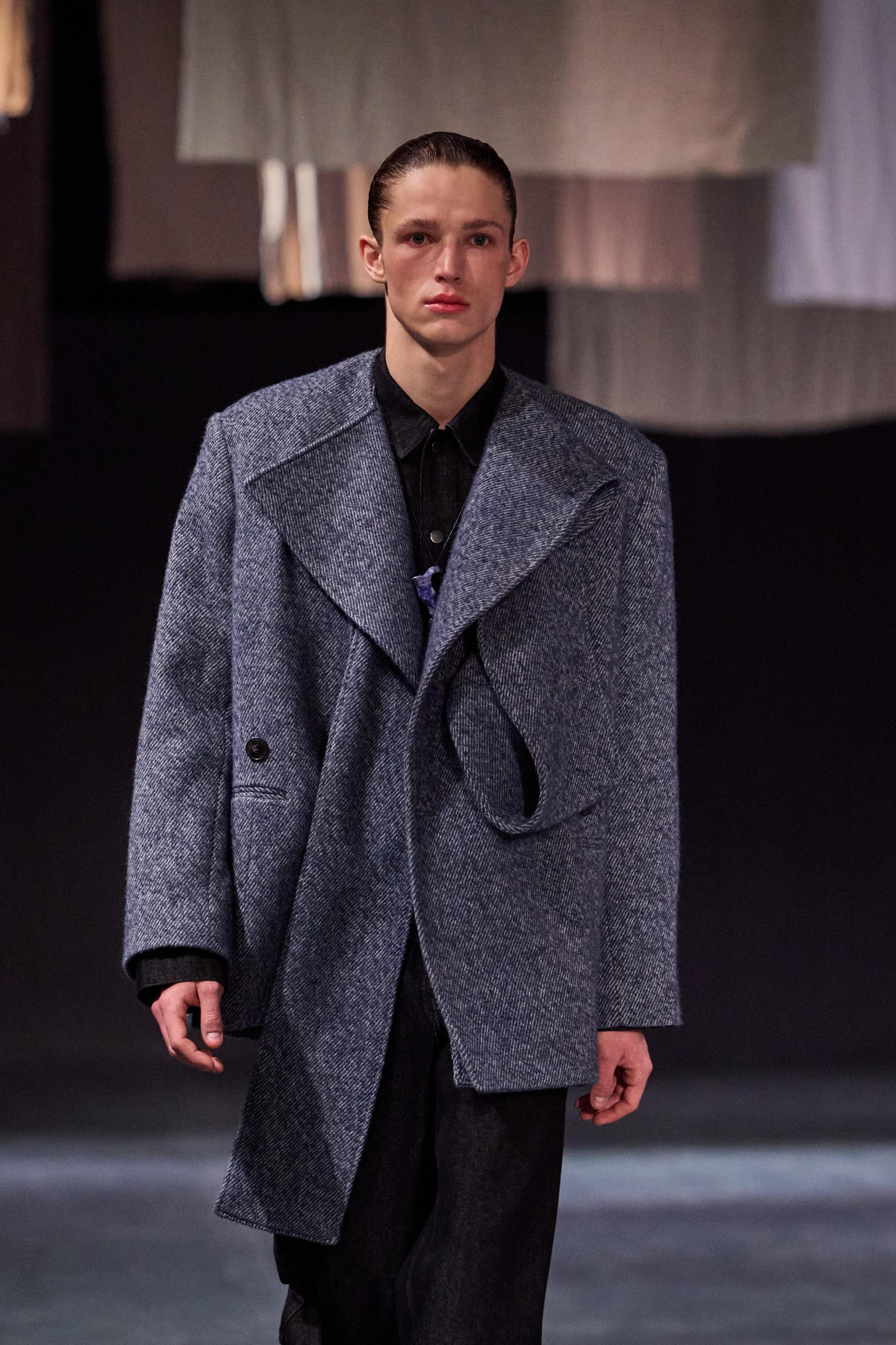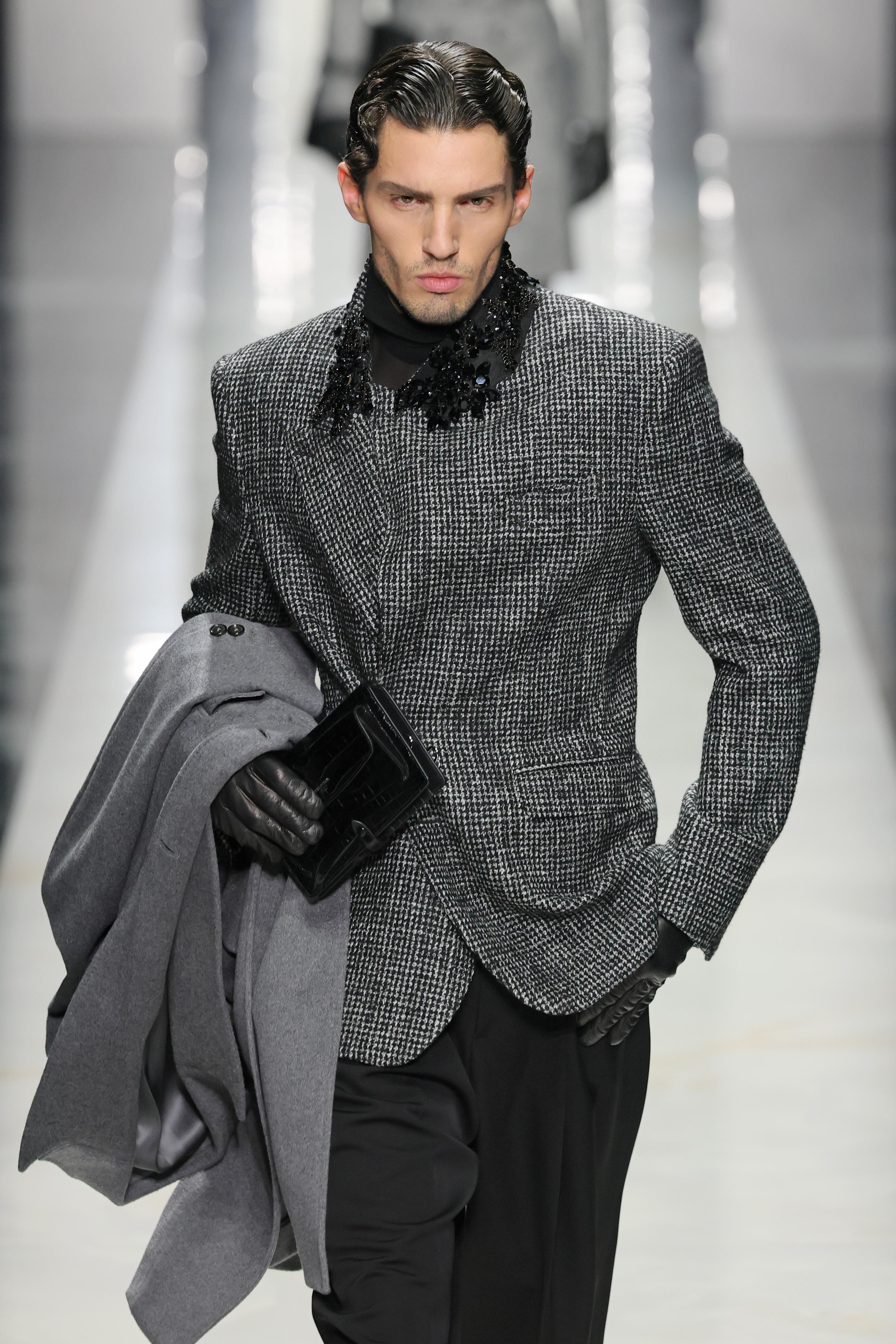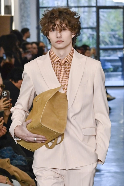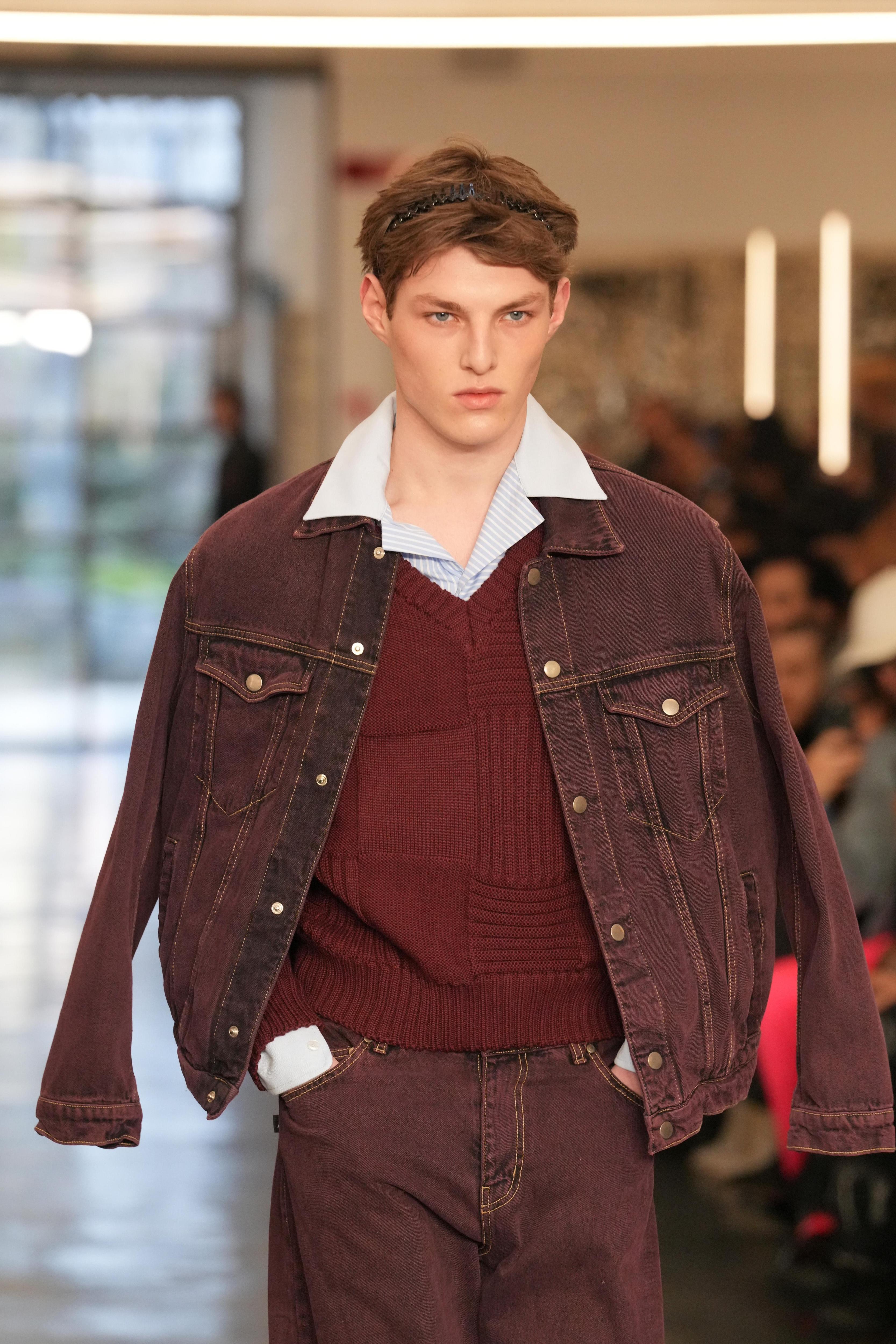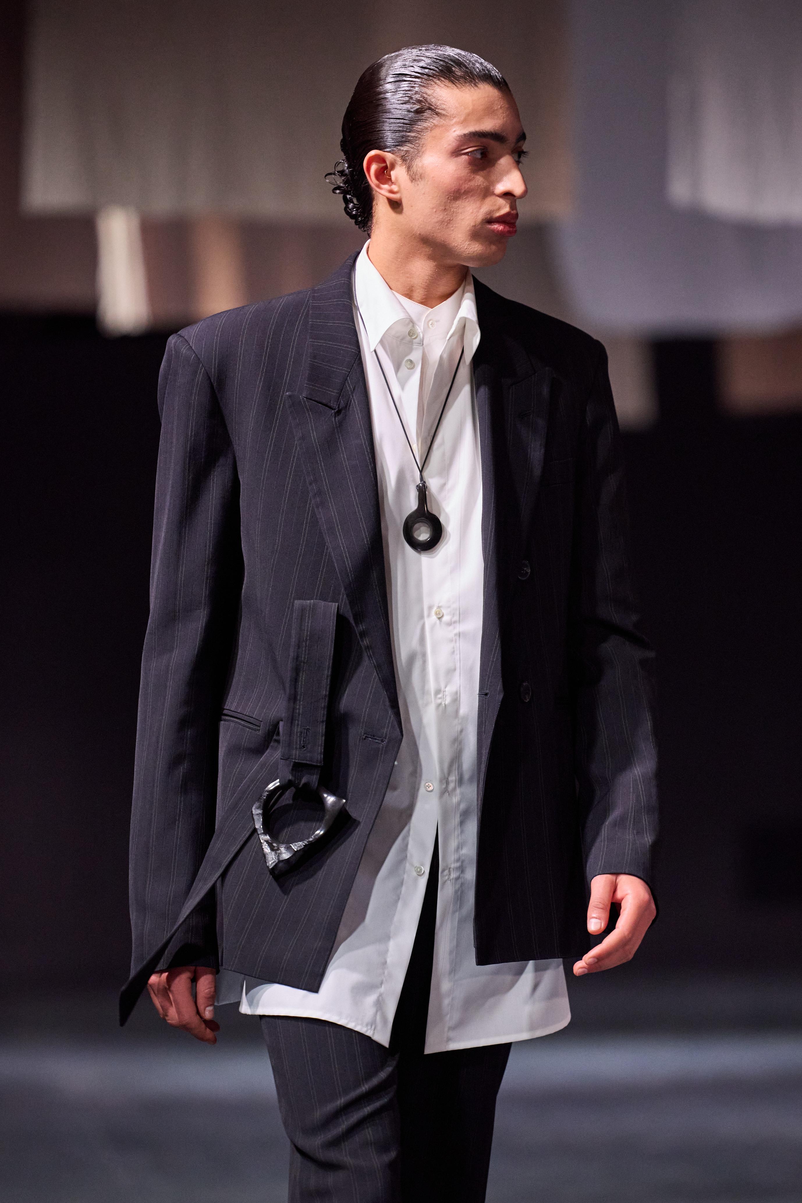 David Catalán неожиданно, но очень уверенно возвращает в мужской гардероб ободки. Это аксессуар выполняет роль функционального элемента образа, который структурирует прическу и не позволяет прядям челки упасть на лицо. Ободок удерживает волосы, подчеркивает линию лба и создает ощущение собранности — на подиуме это выглядело очень свежо.