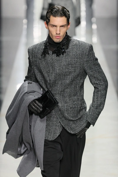 Giorgio Armani традиционно говорит языком сдержанной роскоши, так что мокрая укладка в его интерпретации — не исключение. Для показа стилисты выбрали сочетание текстурированности с благородным блеском. Волосы зачесаны назад, но не до идеальной гладкости, и некоторые прядки выбиваются из прически. Такая укладка смотрится аккуратно, хоть и с легкой долей небрежности. В реальной жизни этот тренд легко адаптируется — достаточно геля с «мокрым» финишем и расчески.