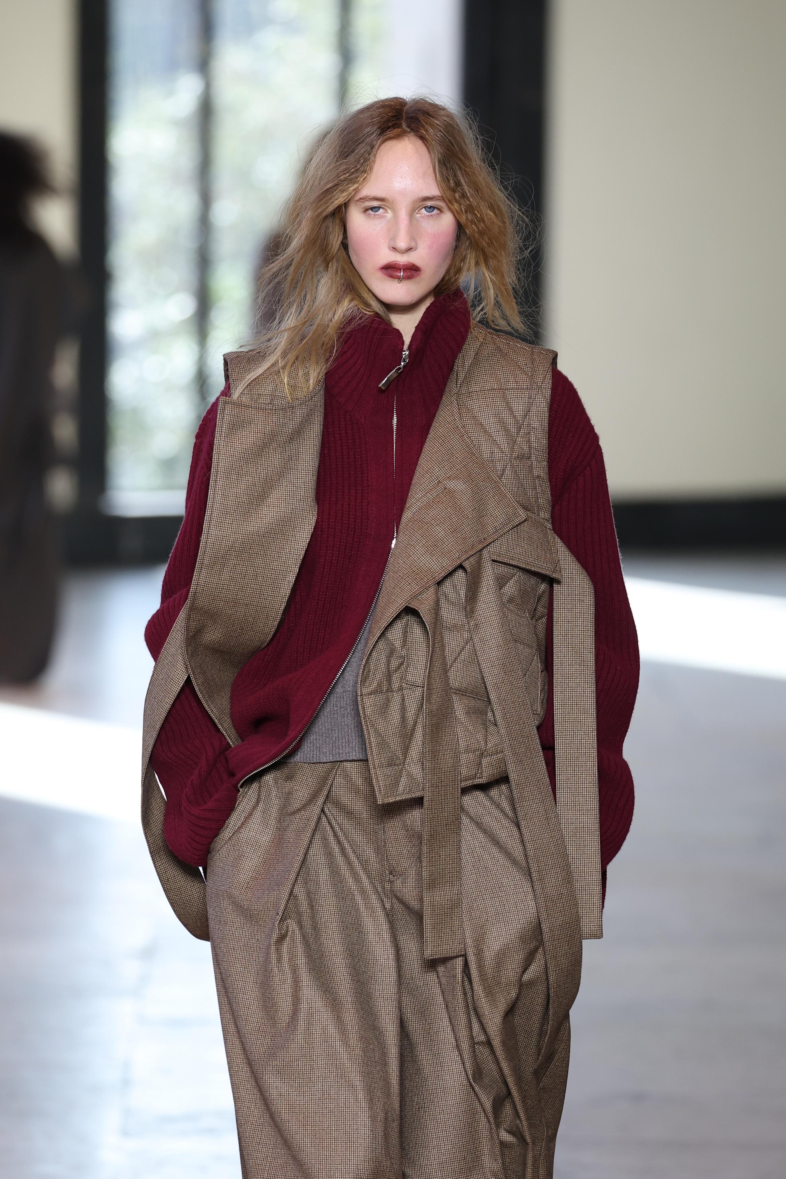 На показе Ujoh модели показали минималистичные макияжи, главным в которых были губы с растушеванным, даже слегка смазанным контуром. Из-за темного цвета помады такой образ выглядит очень смелым и эффектным, так что если подходить к такой растушевке с умом, будешь выглядеть круто.