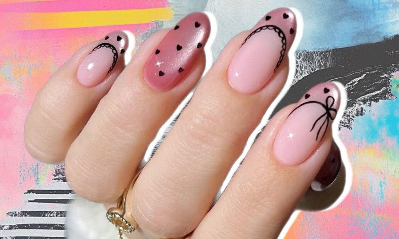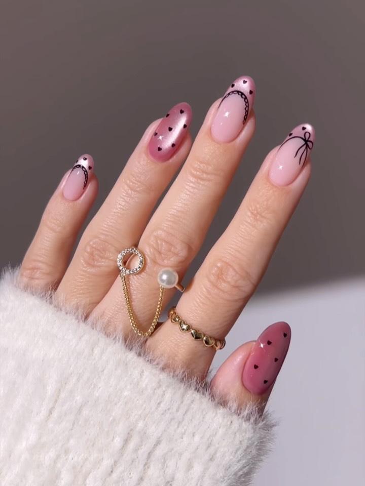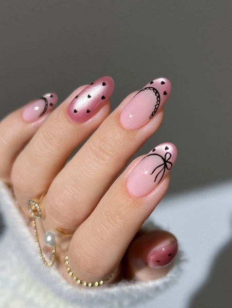 Главная фишка этого дизайна — разнообразие. Все элементы маникюра разные, и объединяют розовая гамма и эффект «кошачьего глаза», который придает ногтям мягкое сияние и глубину. На двух пальцах — розовый «кошачий глаз» с мелкими черными сердечками. Основа выглядит полупрозрачной и светящейся, а крошечные сердечки добавляют графичности и чуть ироничного настроения. Они не бросаются в глаза издалека, но при ближайшем рассмотрении делают маникюр особенно интересным.