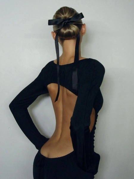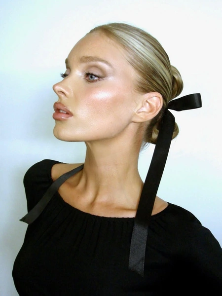 Прическа Эльзы — отдельная роскошь. Гладкий и низкий пучок выглядит просто безупречно. Он сделан в виде бантика, который в середине перевязан лентой с еще одним бантом. Черный аксессуар прекрасно сочетается с платьем модели. Он напоминает одновременно об эстетике балеткор и минимализме старого Голливуда — нарядно и немного драматично. Если ты тоже выбрала на Новый год черное платье, то вдохновляйся образом Эльзы, чтобы стилизовать свой лук.