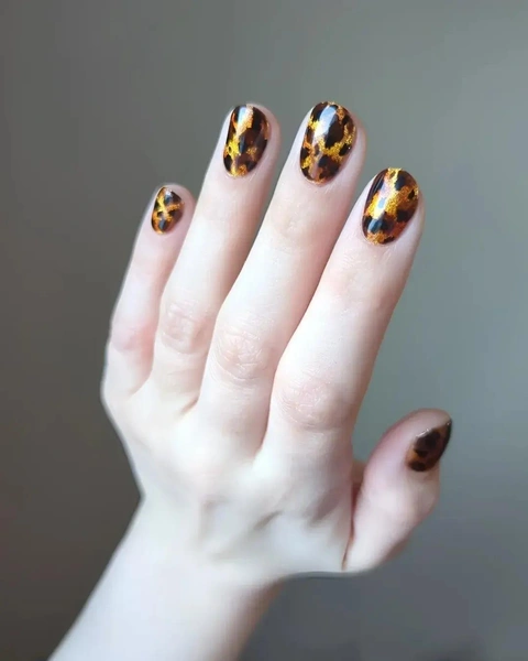 Комбинация черепашьего принта и блесток создает максимально эффектный, праздничный дизайн. Самый простой способ интегрировать блеск в маникюр — использовать в качестве базы золотой лак вместо янтарного или коричневого. Это красивый нейл-арт для особых случаев, вечерних мероприятий, праздников и просто дней, когда хочется сиять!