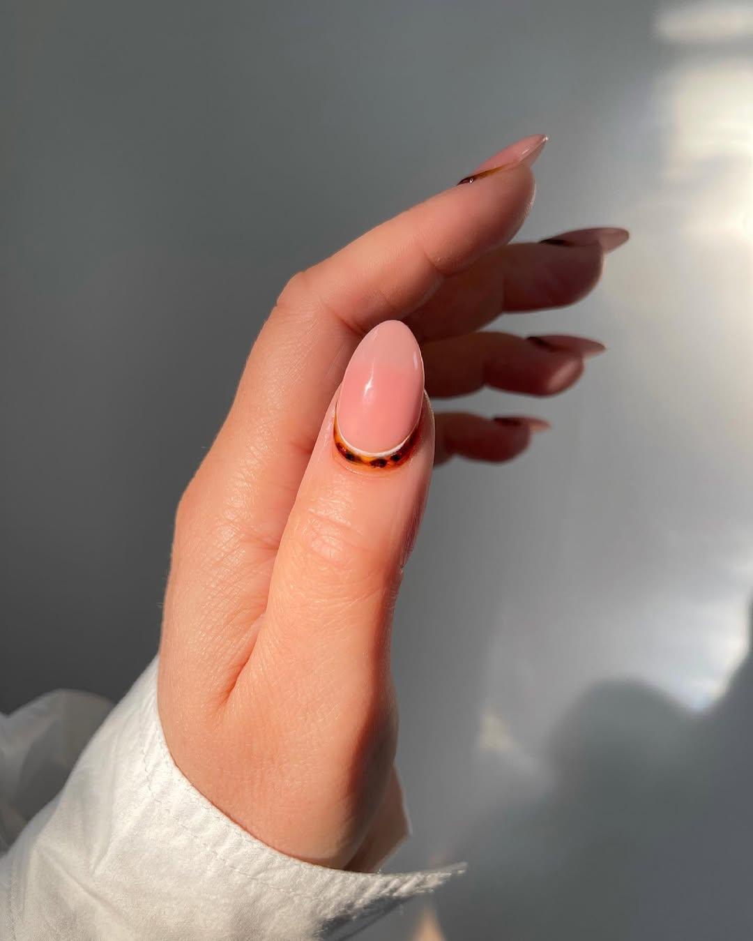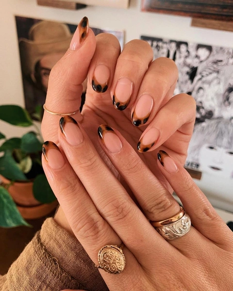 Классический френч смотрится еще круче, когда белая улыбка заменяется черепашьим принтом. База пусть будет нюдовой, розовой или прозрачной, а кончик ногтя оформляй в анималистичном узоре. Линия улыбки может быть традиционной полукруглой или более современной — прямой, волнистой, асимметричной. Черепаховый кончик создается теми же техниками, что и полное покрытие — капли разных оттенков, растушеванные для создания характерных пятен.