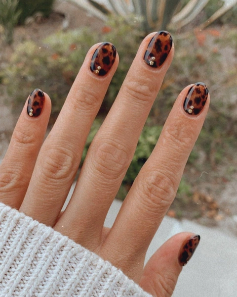 Черепаший принт сам по себе выглядит роскошно, но стразы поднимают его на новый уровень. Базовый дизайн такой — покрывай все ногти пятнистым дизайном, а потом украшай все стразами у кутикулы. Их можно разместить несколькими способами. Вдоль кутикулы — создает эффект украшенного основания, как драгоценная оправа. Один-два кристаллика на ногте — элегантный минимализм. Только выбирай золотистый камушки, а не классические серебристо-прозрачные!