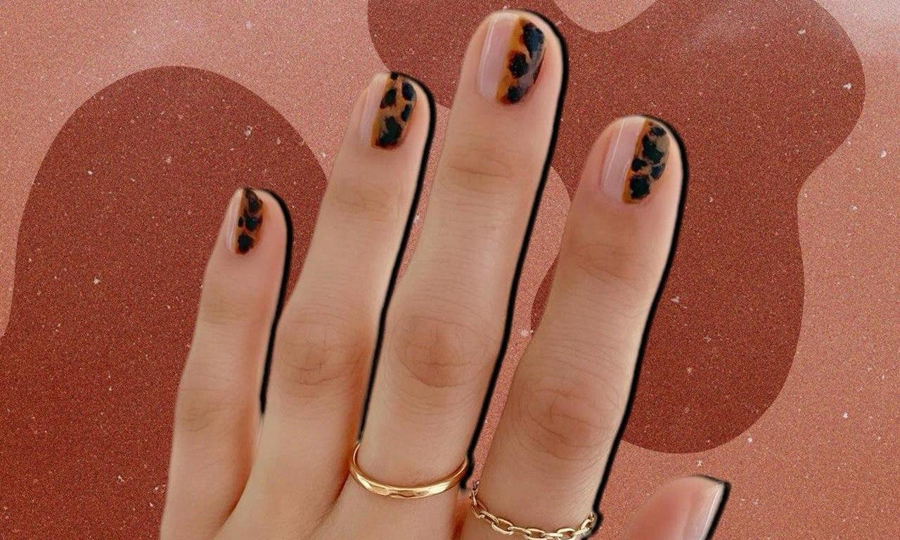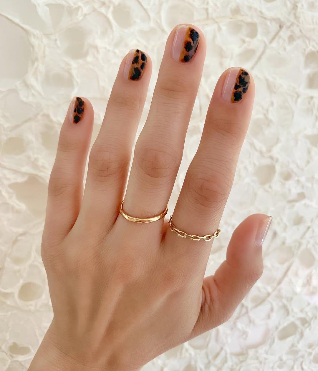 Геометрическое решение! Каждый ноготь подели пополам вертикально, и одну половину покрой черепашьим принтом, а вторую — однотонным цветом. Лучше всего выбрать нюд, чтобы добавить маникюру воздуха и изящества. Если хочешь, можно подчеркнуть границу между дизайнами тонкой белой или золотой полоской.