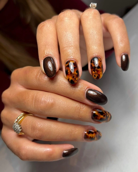 Самый сбалансированный и универсальный подход — использовать черепаховый принт только на одном-двух ногтях, оставляя остальные однотонными. Обычно акцентными становятся безымянный и средний пальцы, или только безымянный на каждой руке. Однотонные ногти покрой каким-нибудь из цветов палитры черепахового принта — карамельным, коричневым, черным, янтарным. Это создает цветовую гармонию и не дает дизайну выглядеть хаотично.