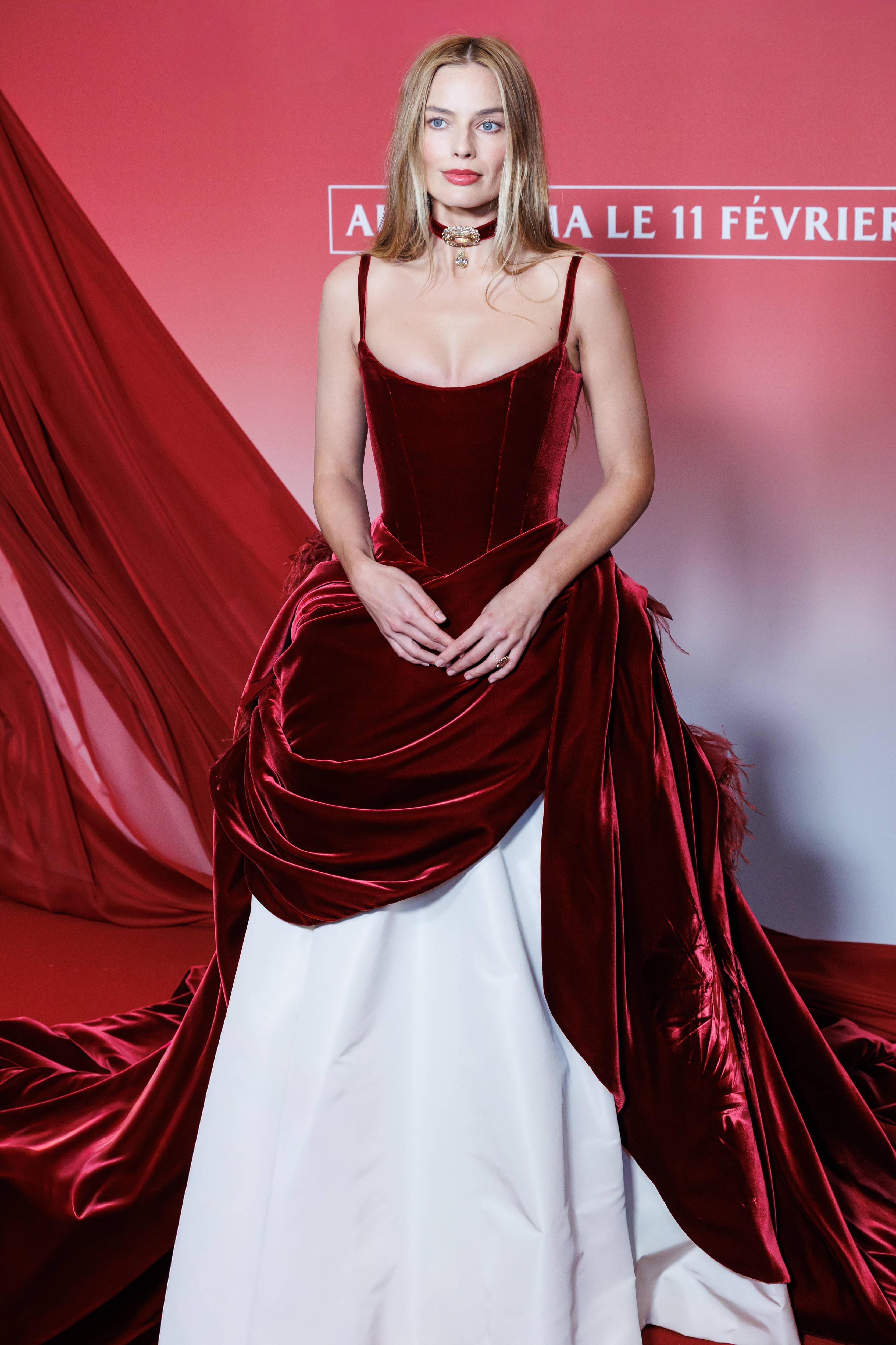 Платье Марго — главная звезда образа. Наряд от Chanel с корсетом и драпировками создан из бордового шелка, бархата и фая с нижней юбкой из слоновой кости. Корсет делает силуэт четким, а драпировки добавляют объем и движение, делая платье скульптурным. Наряд украшен сложными перьями — это ручная работа.