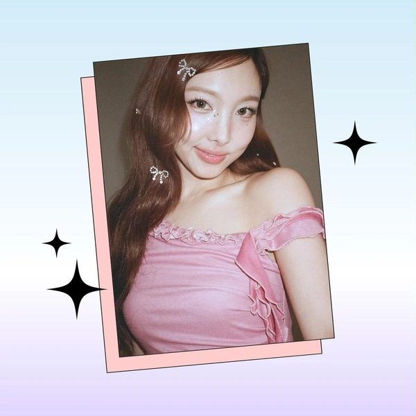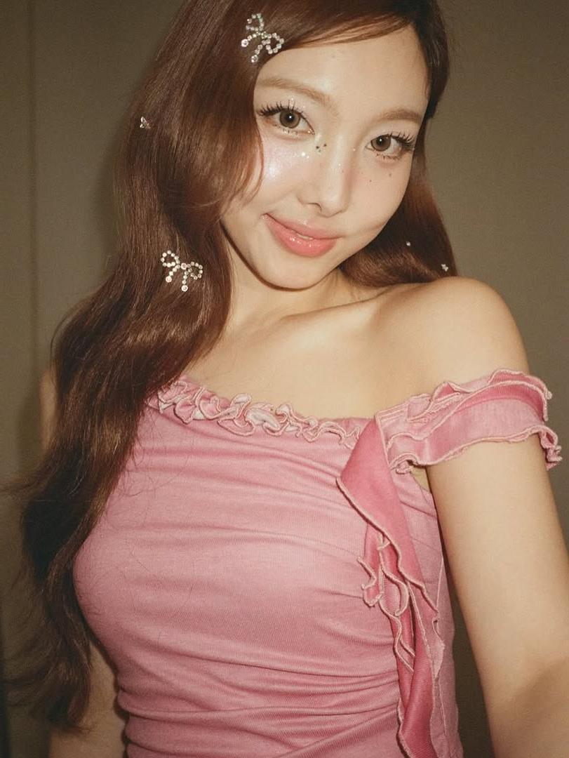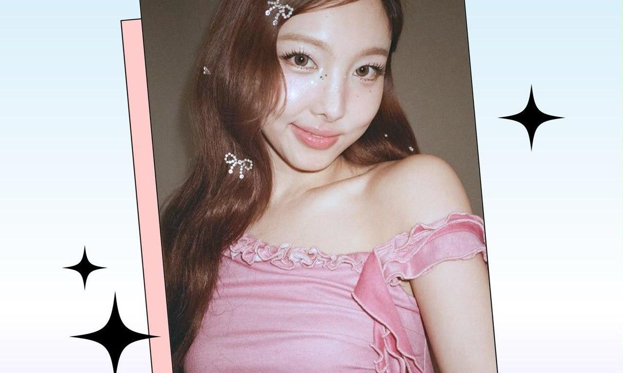 Наён сочетала свой маникюр с розовым платьем с милыми рюшами. В макияже она использовала и глиттер в виде звездочек под глазами, и шиммерные тени на веках. Розовые губы перекликаются по цвету с платьем. А заколки в виде бантиков из страз — идеальное дополнение блестящего маникюра.