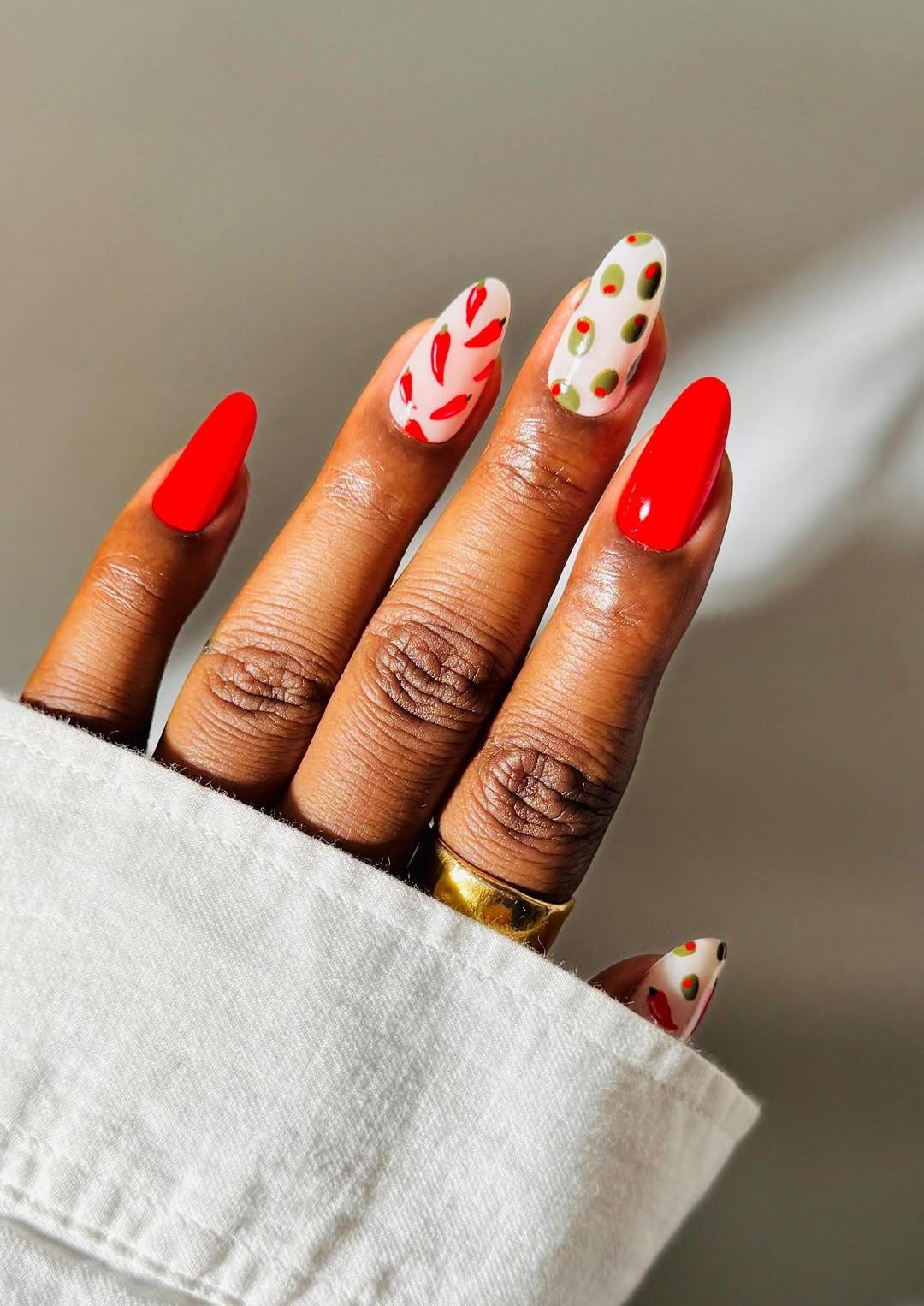 Ну а если ты фанатка острых оливок с перчиком, то красно-зеленый маникюр — твой выбор! Парочку ногтей покрой красным лаком, а на одном нарисуй миниатюрные острые перцы. Можешь воспользоваться стемпингом, если есть подходящая пластина. Еще один ноготь укрась узором из оливок. А оставшийся покрой и перчиками, и оливками сразу.