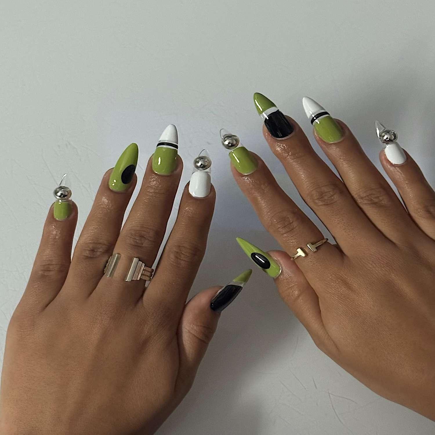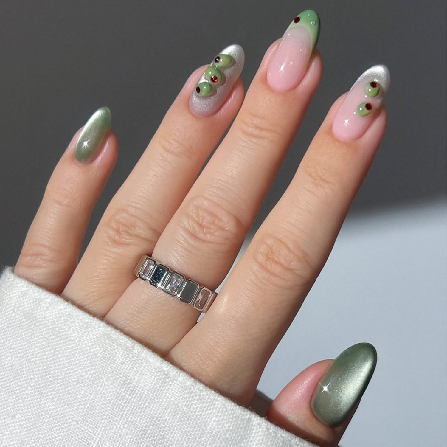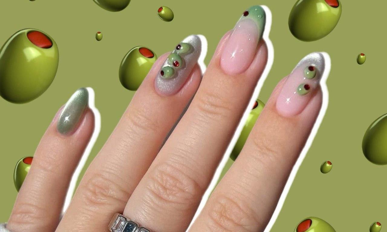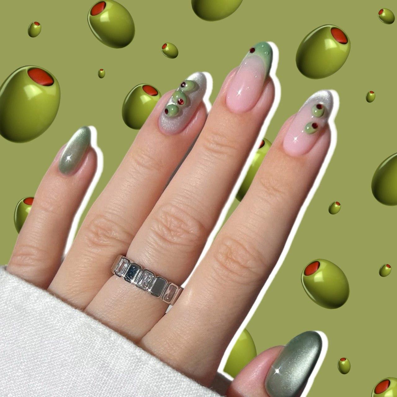 Девушкам с длинными ногтями френч идет больше всего. Нарисуй его зеленым, а в качестве базы используй молочный лак с незаметным легким шиммером. Сделай парочку ногтей бежевыми, а один прозрачным. Лучшим украшением станут объемным оливки на шпажке, напоминающие украшение мартини.