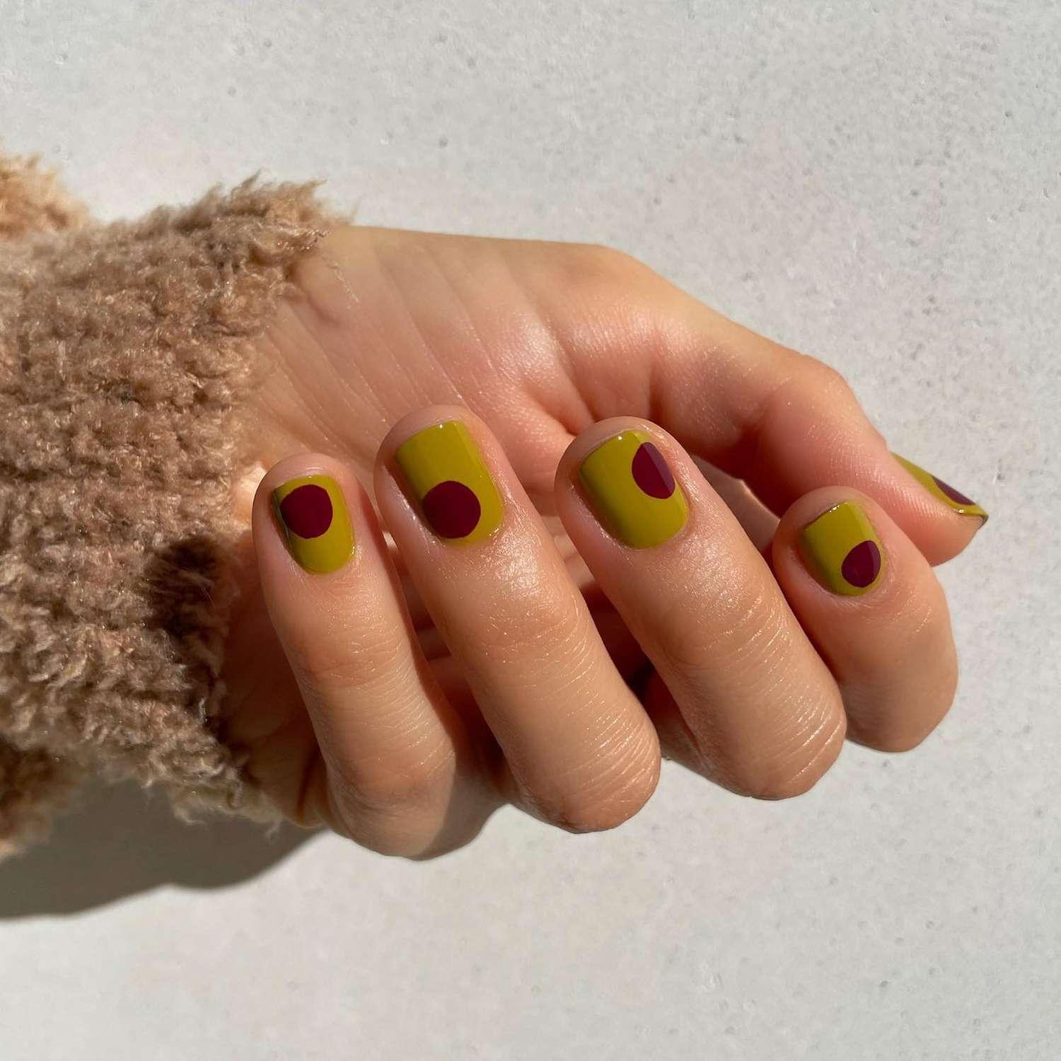 На короткой длине не так просто разместить объемные узоры так, чтобы они могли располагаться комфортно. Поэтому можешь просто покрыть ногти оливковым цветом и нарисовать темно-красные кружочки. Это минималистично, стильно и очень нарядно!