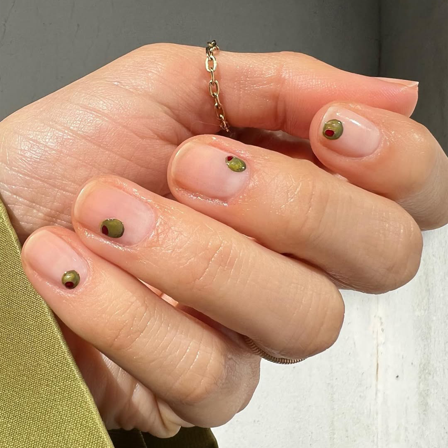 Фанаткам реалистичных маникюров точно понравится украсить ногти миниатюрными рисунками оливок. Используй для них сразу несколько оттенков, чтобы верно отразить цвета тени и зоны, куда падает свет. Размещай такие рисунки в разных местах на каждом ногте, чтобы маникюр смотрелся интереснее.