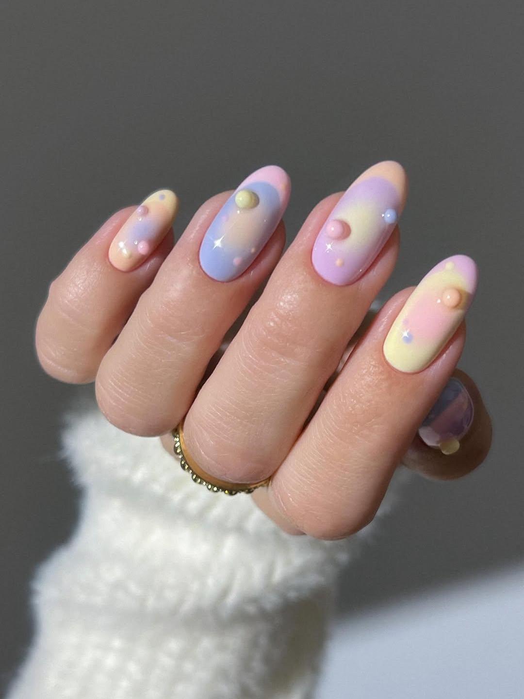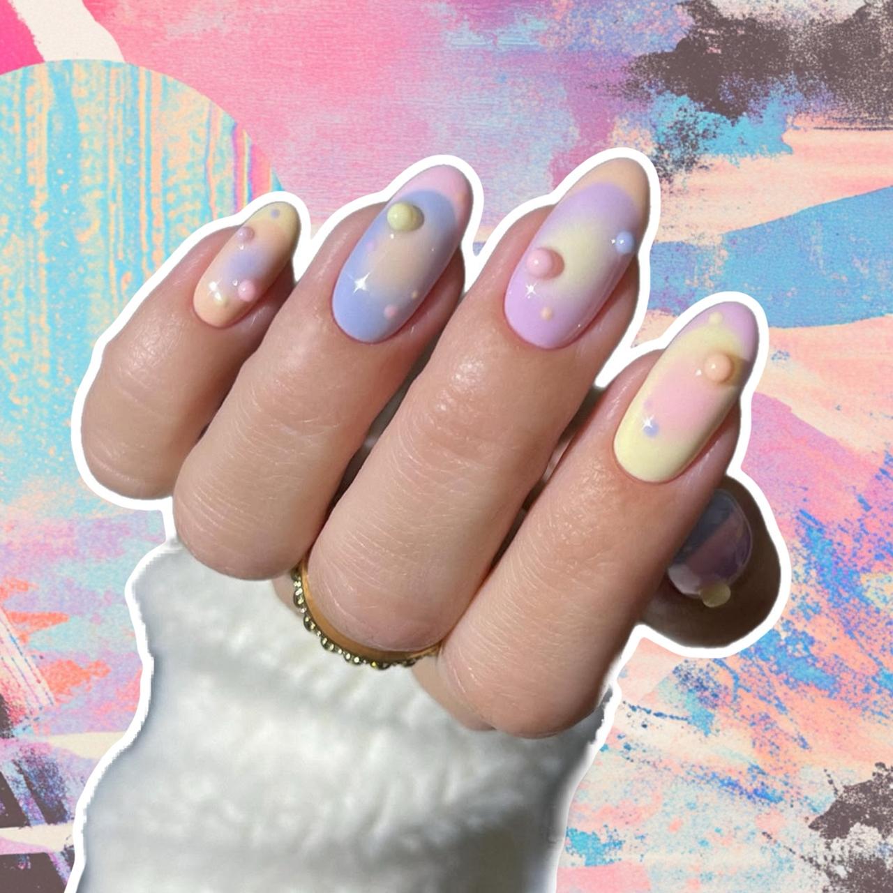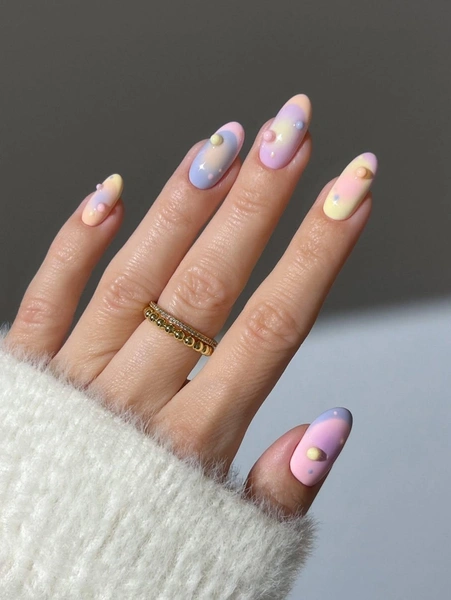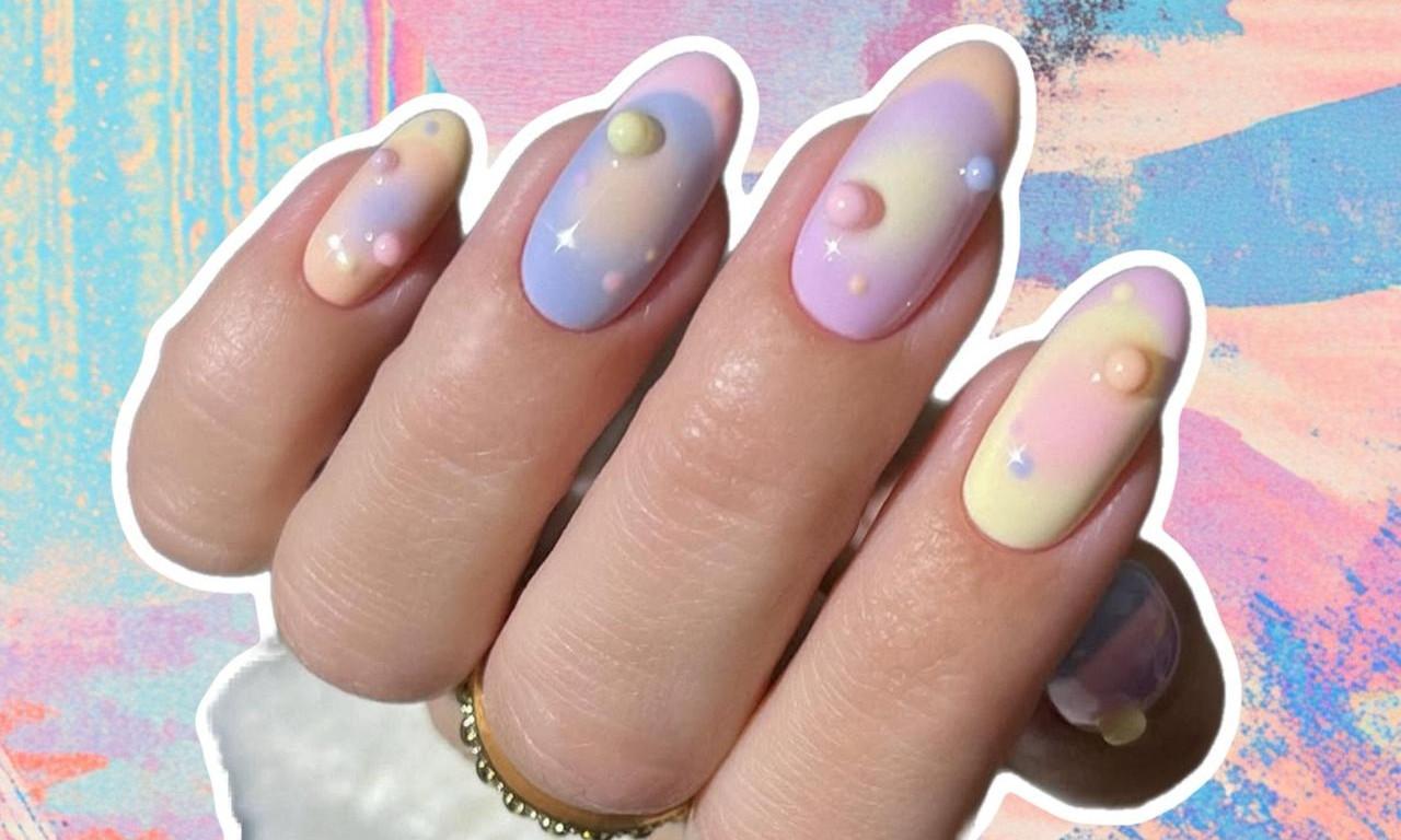 Для этого дизайна ногтей тебе понадобятся всего четыре плотных пастельных лака — розовый, лимонный, лавандовый и персиковый. Главное, чтобы цвета сочетались и напоминали конфетки или молочные коктейли. Ну и важно, чтобы тебе было комфортно с ними работать — наносить, растушевывать, раскрашивать.