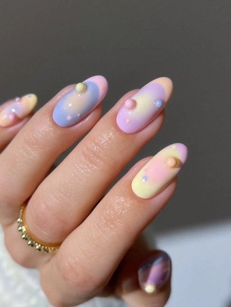 Финальный шаг маникюра — разноцветные объемные шарики. Делай их разного размера — покрупнее и поменьше. И раскрашивай каждый в тот цвет, которого еще нет на ногте. Например, если ты выбрала лавандовую базу, сделала персиковый градиент и нарисовала розовый френч, то этот дизайн делай желтым. В конце покрой все ногти глянцевым топом.