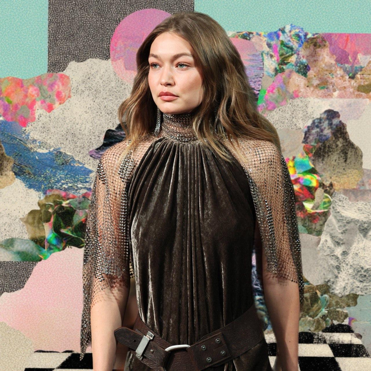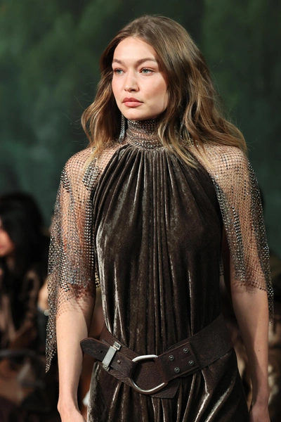 Джиджи Хадид открыла показ в корсете из твида и идеально скроенной юбке. Строгий, структурный верх сочетался с женственным силуэтом, подчеркивая талию. Финальный выход стал еще более эффектным. Джиджи появилась в коричневом бархатном халтер-платье, перехваченном на талии массивным кожаным ремнем с O-образной пряжкой. Платье дополняли летящие рукава из кольчужных цепочек, добавлявшие движению образу и создававшие ощущение доспеха.