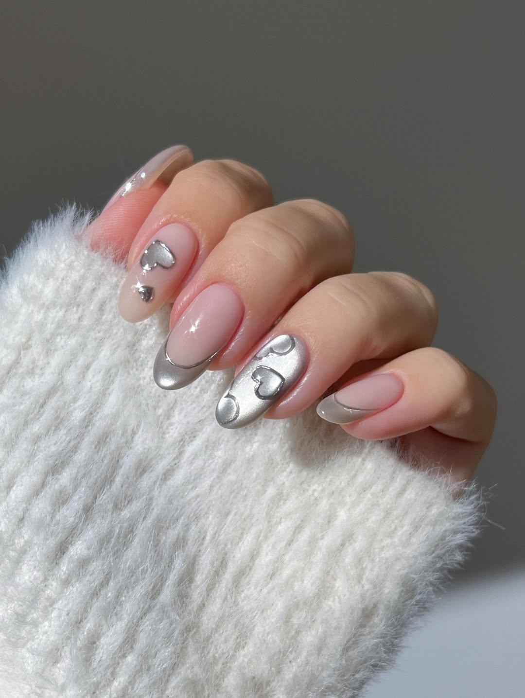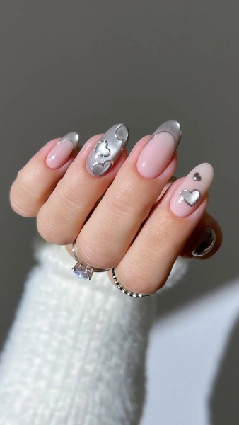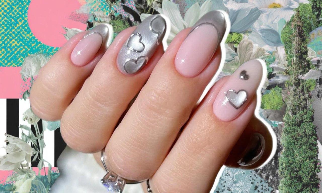 Этот маникюр — идеальный баланс между трендом на металлик и романтической тематикой Дня святого Валентина. Хоть он и не розовый или красный, он сохраняет праздничное настроение через символику 14 февраля. А холодные серебристые оттенки делают дизайн современным и универсальным. Только не забудь позаботиться о своих руках с таким маникюром: все-таки День всех влюбленных еще и о любви к себе самой 💗