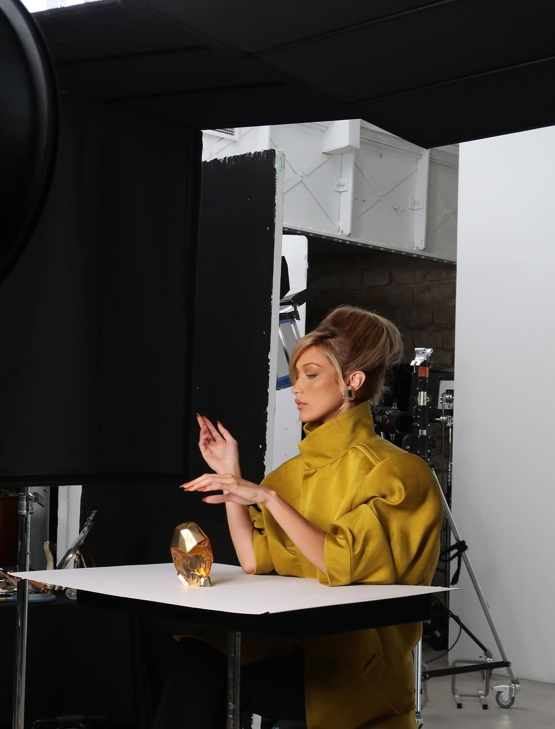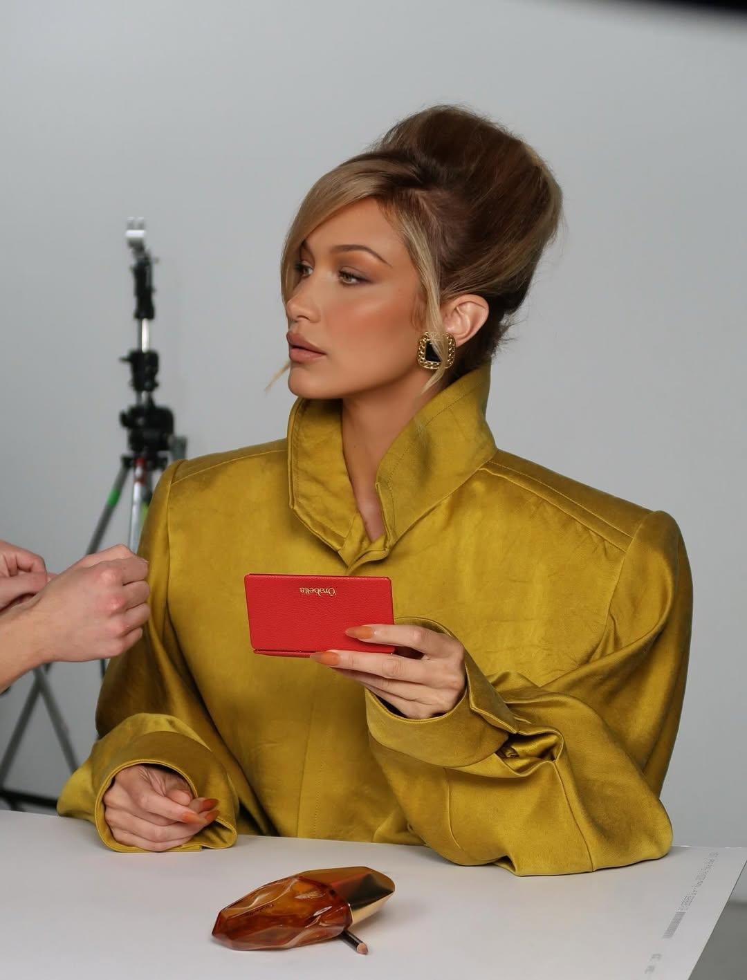 Белла дополнила высокую прическу массивными серьгами: крупными черными камнями в переплетенном золотом обрамлении. В макияже она также использовала теплые оттенки: бронзер на скулах, оранжевые тени, нюдовую помаду. Эта гамма прекрасно сочетается с бутылочкой парфюма Беллы — янтарным флаконом необычной формы с золотой крышкой.