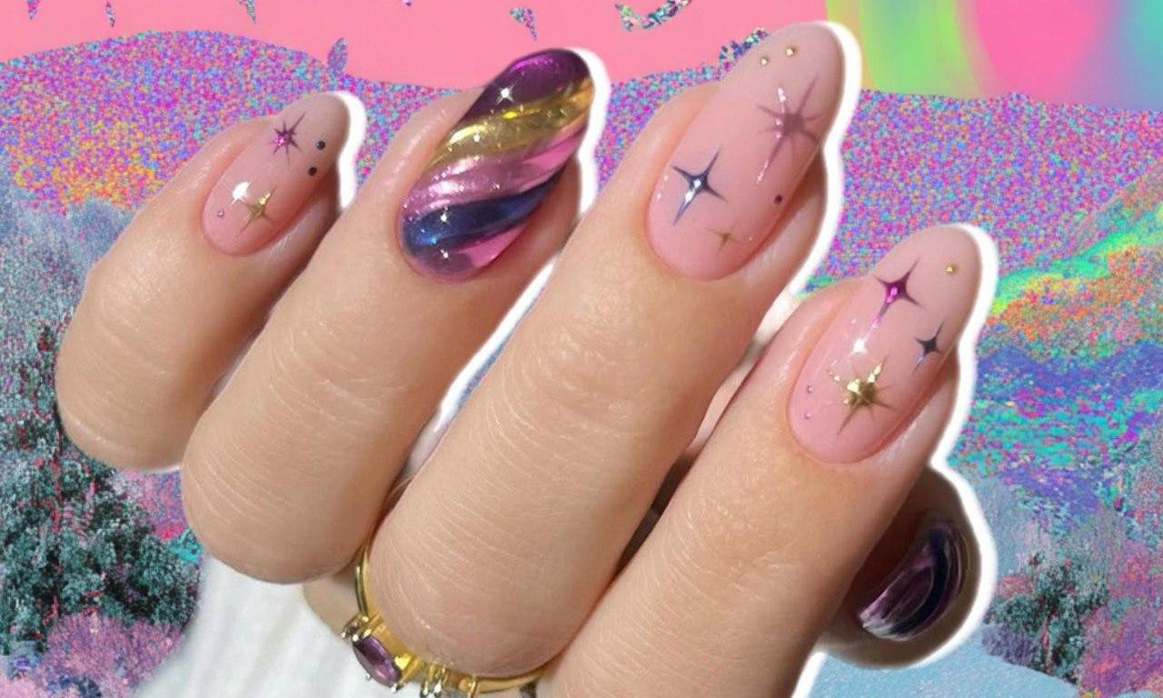 Этот яркий нейл-арт уже создает за тебя половину образа, поэтому задача остальных остального стайлинга — не спорить с ногтями. С украшениями лучше взять паузу. Не нужно надевать все лучшие кольца сразу. Хватит тонких колечек с яркими камнями, но в минималистичном варианте.