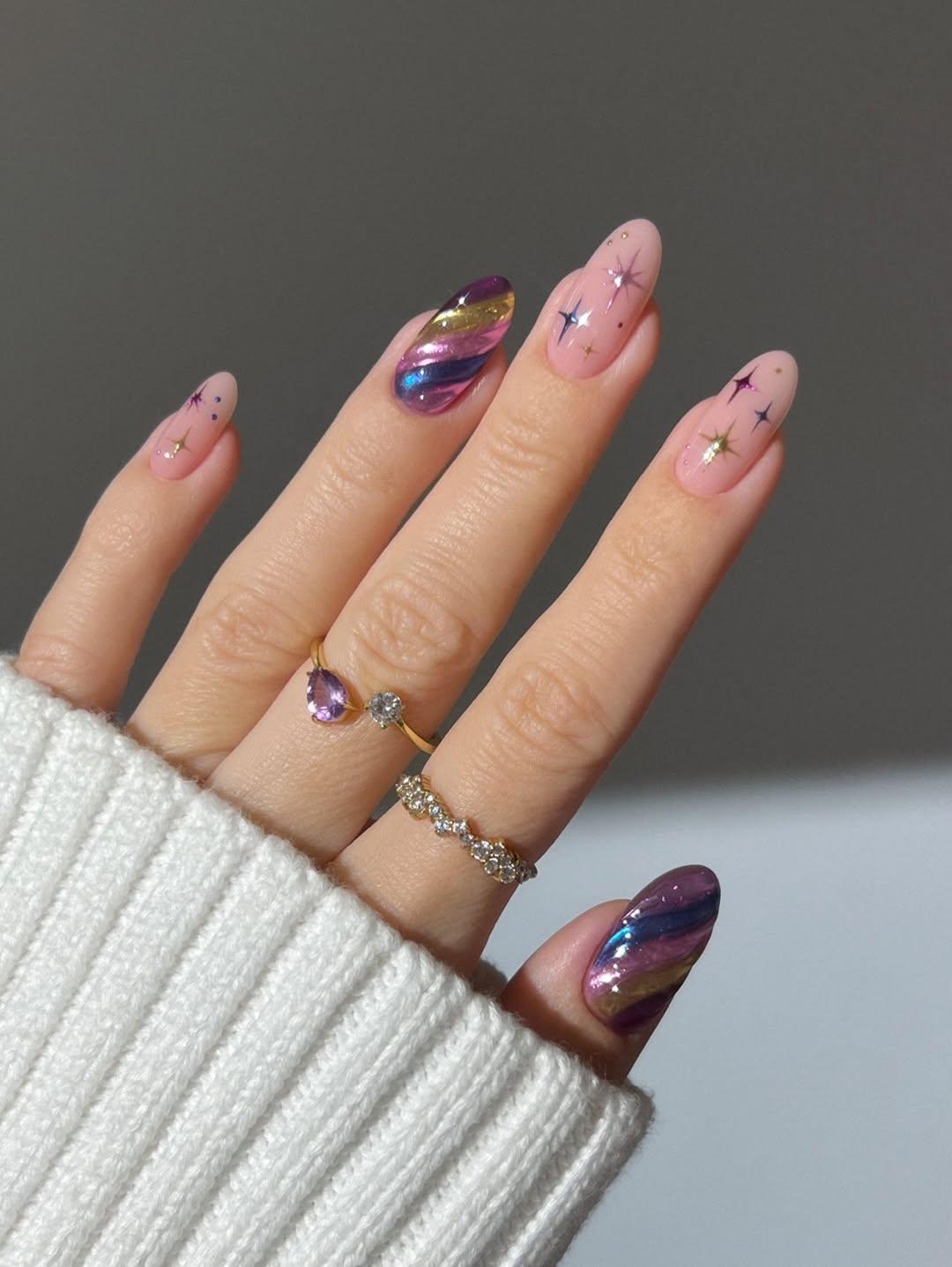 Или же делай разноцветный маникюр. Выбери не один цвет, а сразу несколько. Например, желто-золотой, розовый, фиолетовый, синий. Это настоящий манифест против однообразия! А Новый год — это идеальное время, чтобы подписать его. Я нашла идею дизайна как раз в этой яркой и нарядной гамме.