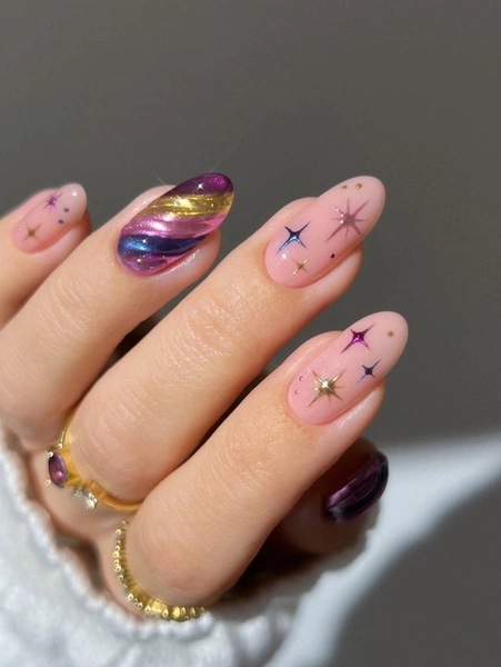 Затем тонкой кистью рисуй звездочки на манер популярного эмодзи в виде блесток ✨ Можешь поставить несколько точек, имитирующих более мелкие блестяшки. Самый простой вариант сделать это — использовать разные лаки. Но для большего блеска я бы посоветовала втирки. С ними получится еще круче! Не забудь про глянцевый топ.