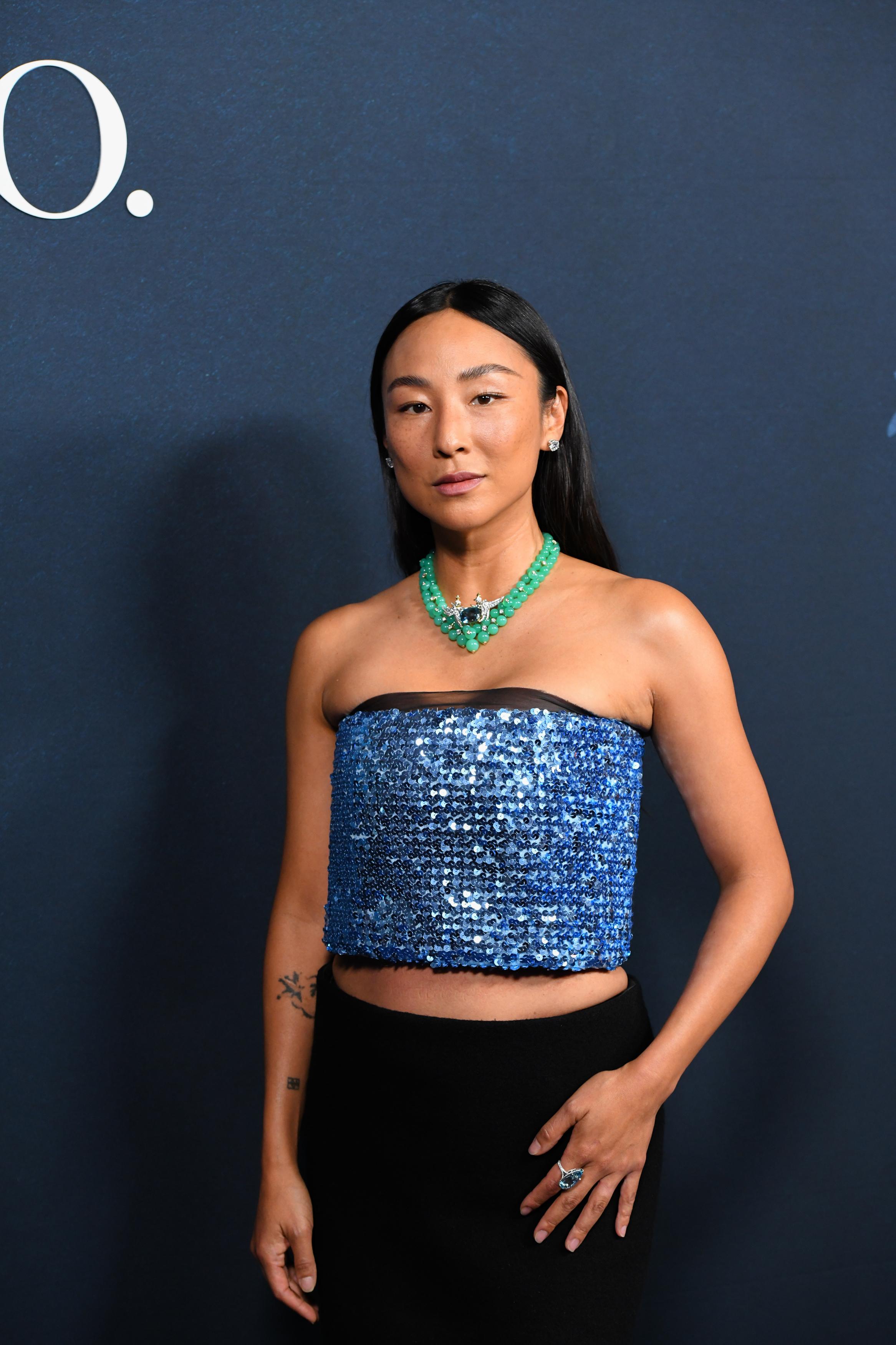 Юци из i-dle выбрала более смелый лук. Мятное платье с пушистой юбкой и блестящим верхом стало самым смелым выбором на этой дорожке. Зато оно прекрасно сочеталось с украшением на шее певицы. Свои каштановые волосы она собрала в хвостик с объемом у корней, а в макияже сделала ставку на теплые коричнево-терракотовые цвета.