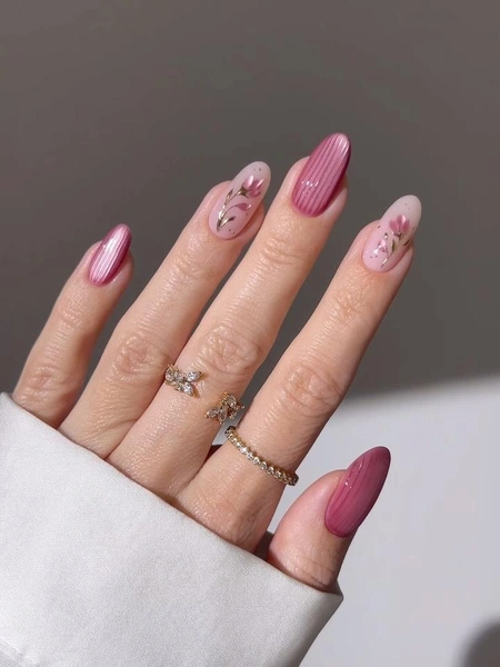 Если весной тебе хочется чего-то красивого, но не банального, этот маникюр — готовый ответ. Он сочетает в себе сразу несколько трендов, которые по отдельности уже всем знакомы, а вместе дают очень свежий эффект. Это и «кошачий глаз», и матовые текстуры, и глянцевые детали, и, конечно, цветы.