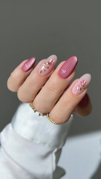 На нюдовых ногтях сначала прорисуй тонкие стебли золотым цветом. Это может быть гель-краска или специальный лак. Главное, чтобы линии были четкими. Затем добавь лепестки с помощью розового «кошачьего глаза». Это сделает цветы более объемными и яркими. Отдельно рисуй каждый лепесток и обрабатывай его магнитом.